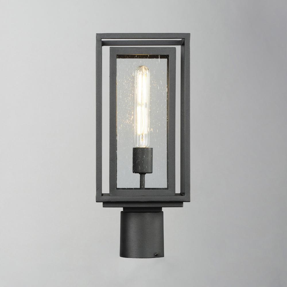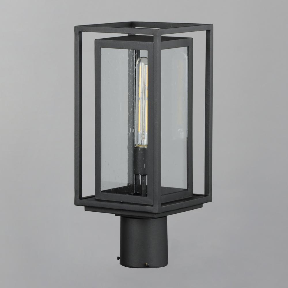 A dual framed structure creates dimension on these outdoor lighting fixtures that is both contemporary and transitional. The construction consists of two frames of square tubing and squared components. The inner frame's Clear Seedy glass reduces gla