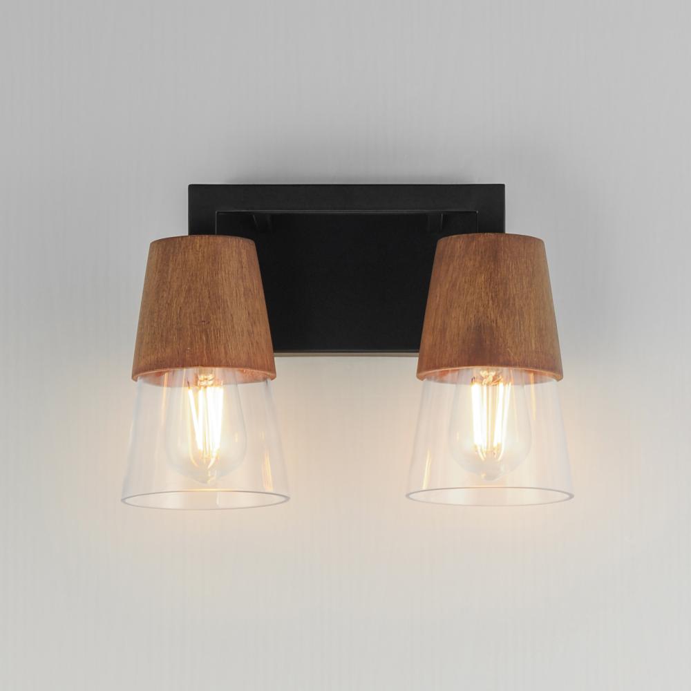 Capped by wood finished in Walnut, this series of bath vanity sconces feature conical Clear Glass shades. Contrasting Matte Black frames of squared tubing add clean geometry to the design. Use decorative lamps in the shades to complete the look.