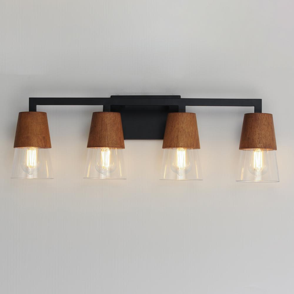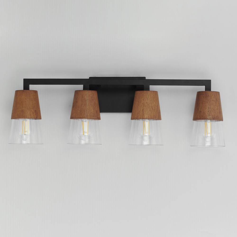 Capped by wood finished in Walnut, this series of bath vanity sconces feature conical Clear Glass shades. Contrasting Matte Black frames of squared tubing add clean geometry to the design. Use decorative lamps in the shades to complete the look.