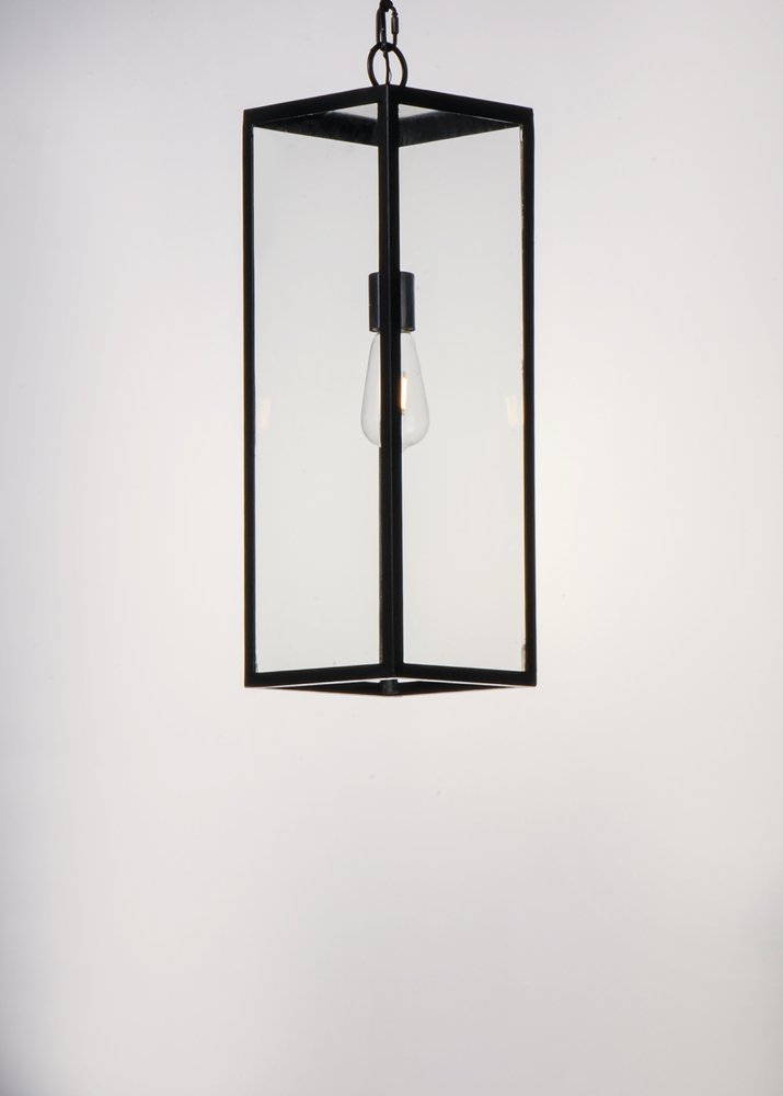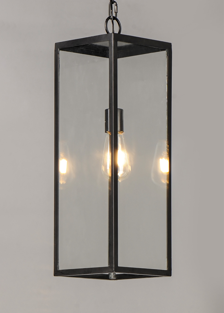 An elongated rectangular shaped design that is both minimalist and industrial. Die cast frames of Dark Bronze support Clear glass panels that provide an unobstructed view of the lantern's interior. Customize with your choice of lamps from vintage to tu