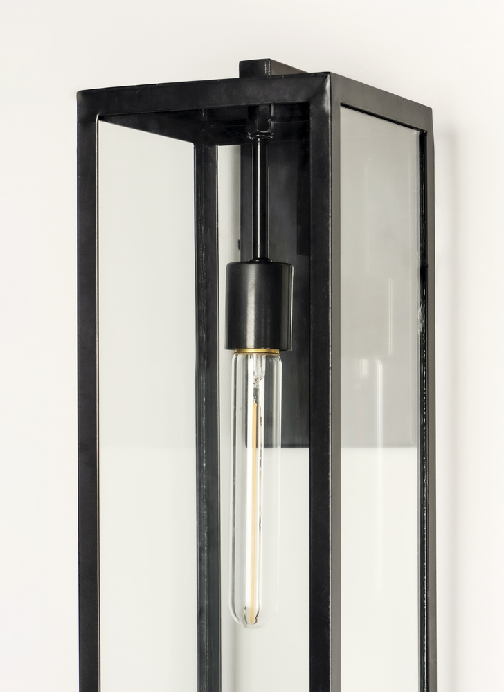 An elongated rectangular shaped design that is both minimalist and industrial. Die cast frames of Dark Bronze support Clear glass panels that provide an unobstructed view of the lantern's interior. Customize with your choice of lamps from vintage to tu