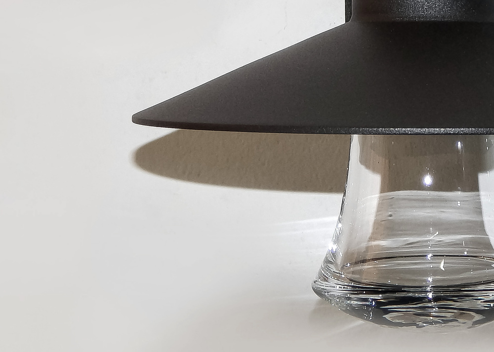Conical shades finished in Architectural Bronze appear to be suspended by its stainless steel cable. Concealed inside these shades is a high powered COB LED which shines into a heavy Clear glass font. The bottom of theses fonts have an additional thickness
