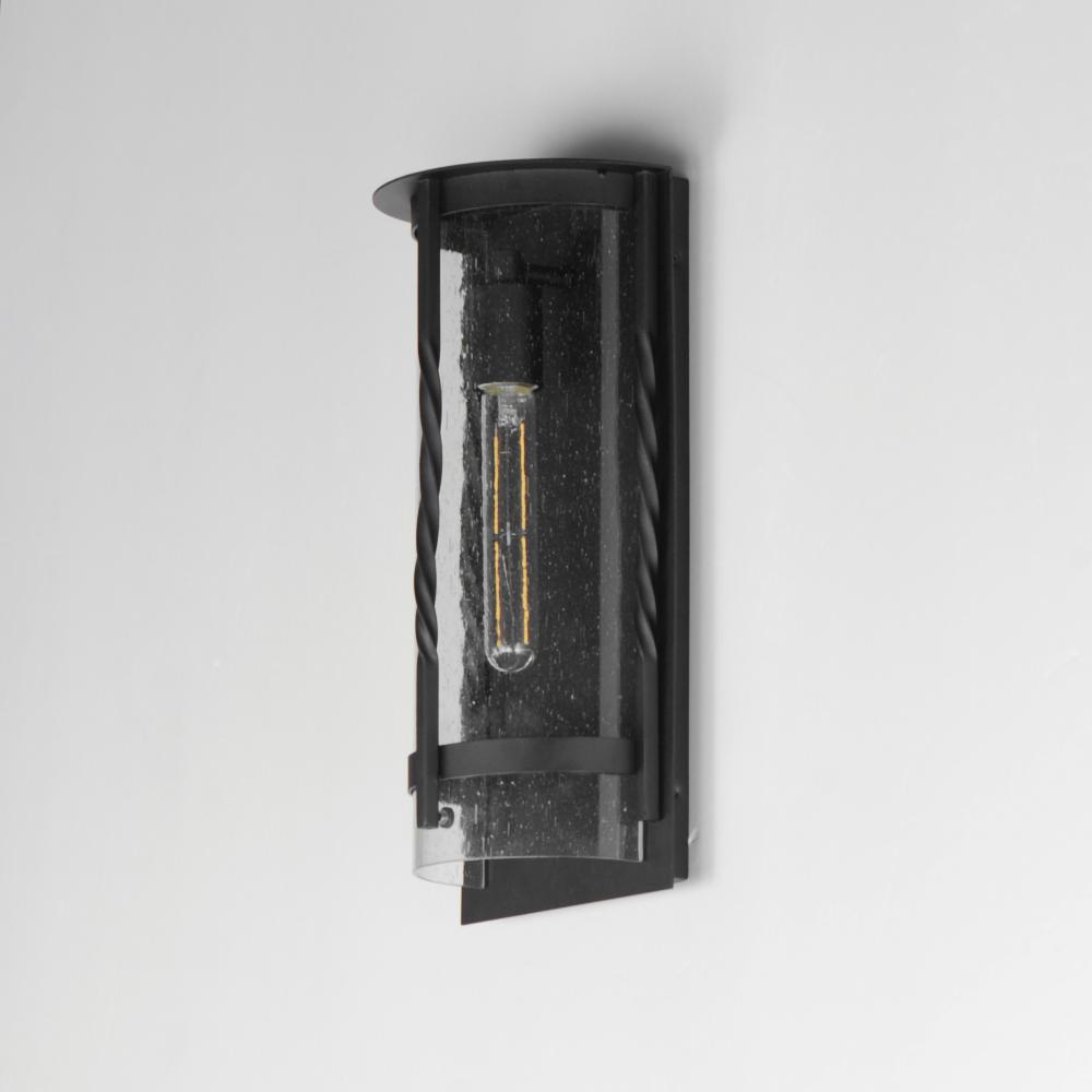 Forged iron spindles twist along the frame of a half round sconce. Transitional in design, they are finished in a Neutral Black outdoor rated powder coat and feature Clear Seeded glass. Use tubular lamps to accentuate the height of the sconces.