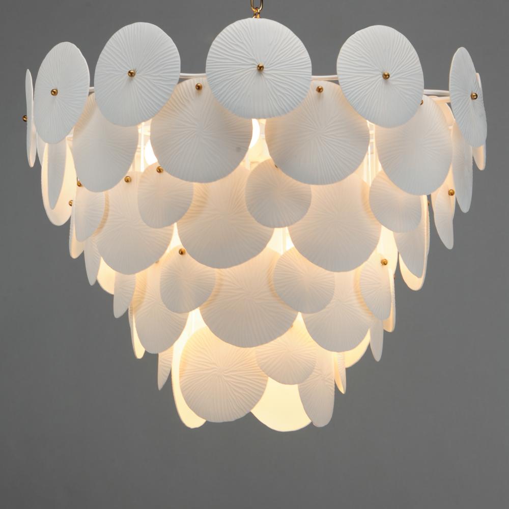 Featuring suspended tiers of textured, translucent ceramic panels, this design softly diffuses light across an undulating Matte White frame. Tiny brass knobs secure the veined ceramic panels, allowing the light to highlight their intricate texture and crea