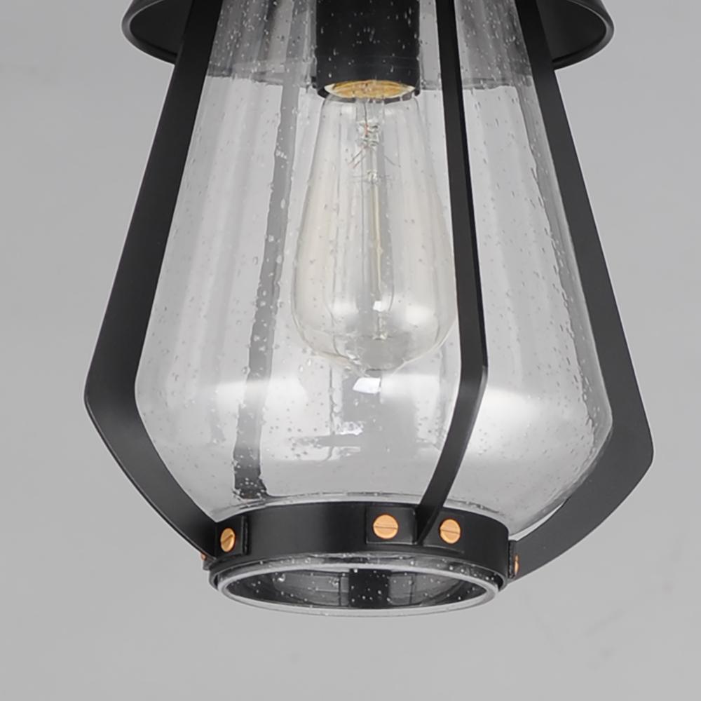 A nod to the nautical, the Marin outdoor sconces feature a two-tone frame of Black with Antique Brass details. Within the frame a pear shaped Clear Seeded glass shields a medium base lamp from the elements. Available in three sizes of sconce, two pendant c