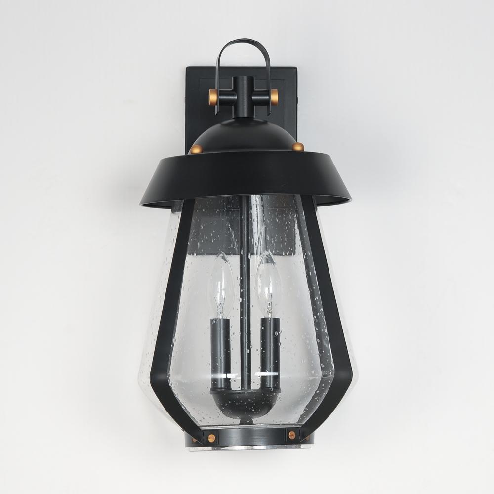 A nod to the nautical, the Marin outdoor sconces feature a two-tone frame of Black with Antique Brass details. Within the frame a pear shaped Clear Seeded glass shields a medium base lamp from the elements. Available in three sizes of sconce, two pendant c