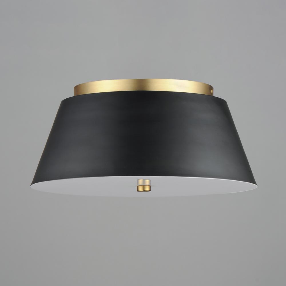 Tapered metal shades are finished in contrasting two-tones of Matte Black and Natural Aged Brass. Dedicated LED light sources cast even lighting across white polycarbonate diffusers. Available in two sizes of flush mount and a dual-plate picture light conf