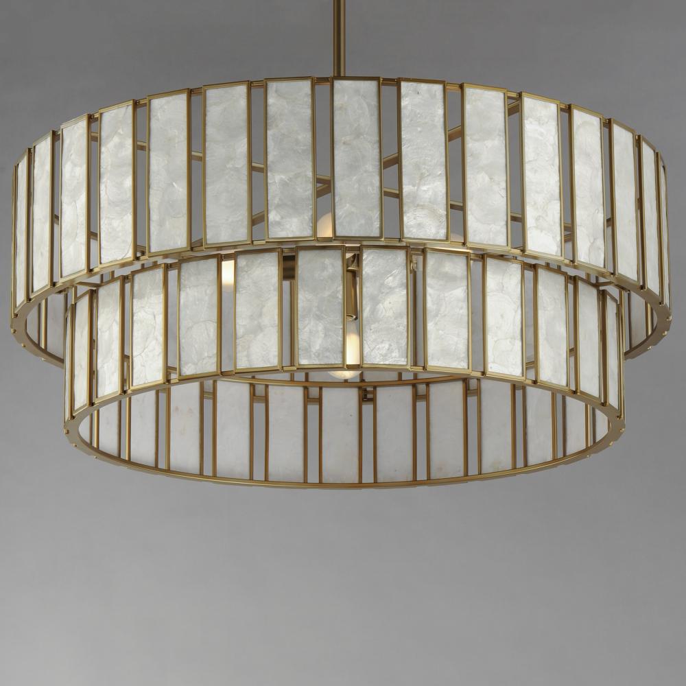 Classic in form and evoking the sea, laminae of Capiz shell are framed in paneled drum shapes. The Natural Aged Brass finish refines the coastal elements and complements the warm glow from behind the translucent panels. Available in multiple configurations