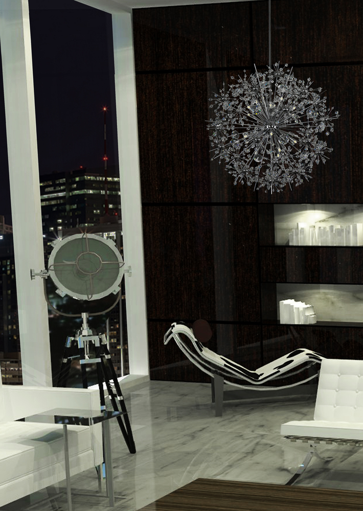 Spectacular display of Beveled Crystal beads of various sizes which are mounted on sculptures Polished Chrome metal formations which will sure to be the focal point of your room. The high power Xenon bulbs add sparkle to the crystal while producing a natu