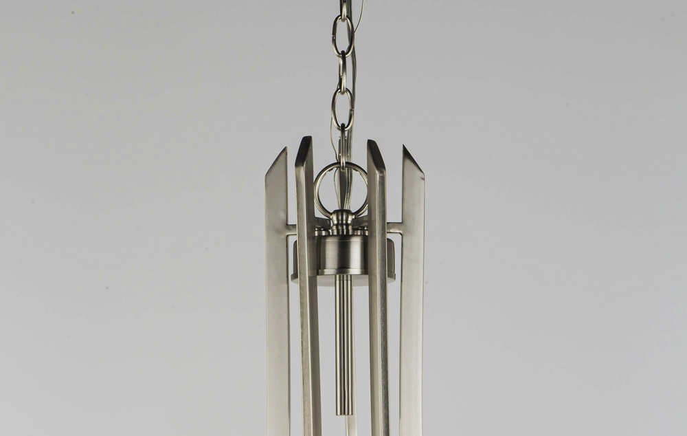 Heavy rectangular tubing support tall scale Satin White glass shades that creates an upscale forged look at a builder price. Available in your choice of Textured Black or Satin Nickel, this collection is complete enough to do the entire home.