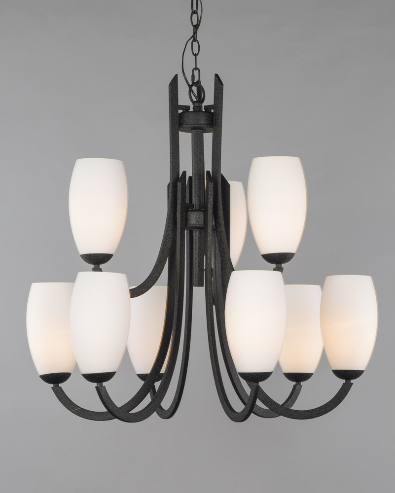 Heavy rectangular tubing support tall scale Satin White glass shades that creates an upscale forged look at a builder price. Available in your choice of Textured Black or Satin Nickel, this collection is complete enough to do the entire home.