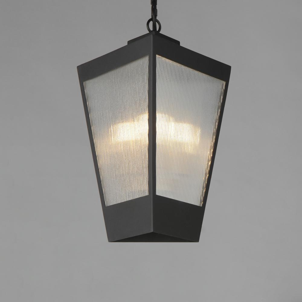 A transitional design suitable for both modern and more traditional applications, this outdoor series of lighting features Clear Ribbed glass that refracts the light source within triangular frames. A Black frame with warm Antique Brass light clusters with