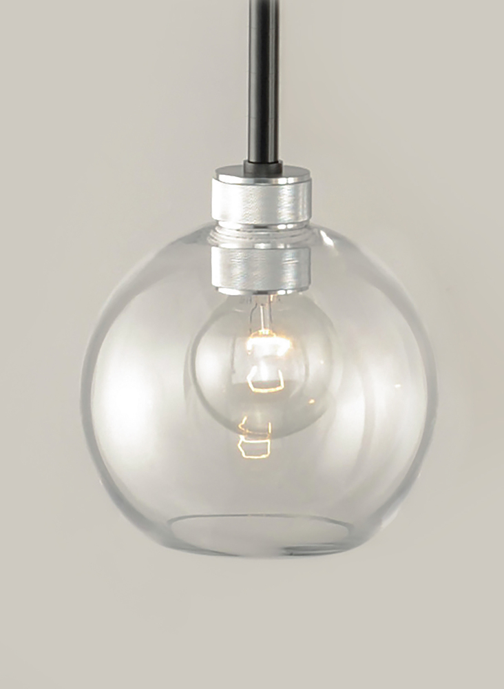 Machined and knurled sockets are finished in Brushed Aluminum which gives stark contrast to the Black round tube frames. Heavy weight Clear hand-blown glass spheres adds scale to this industrial classic.