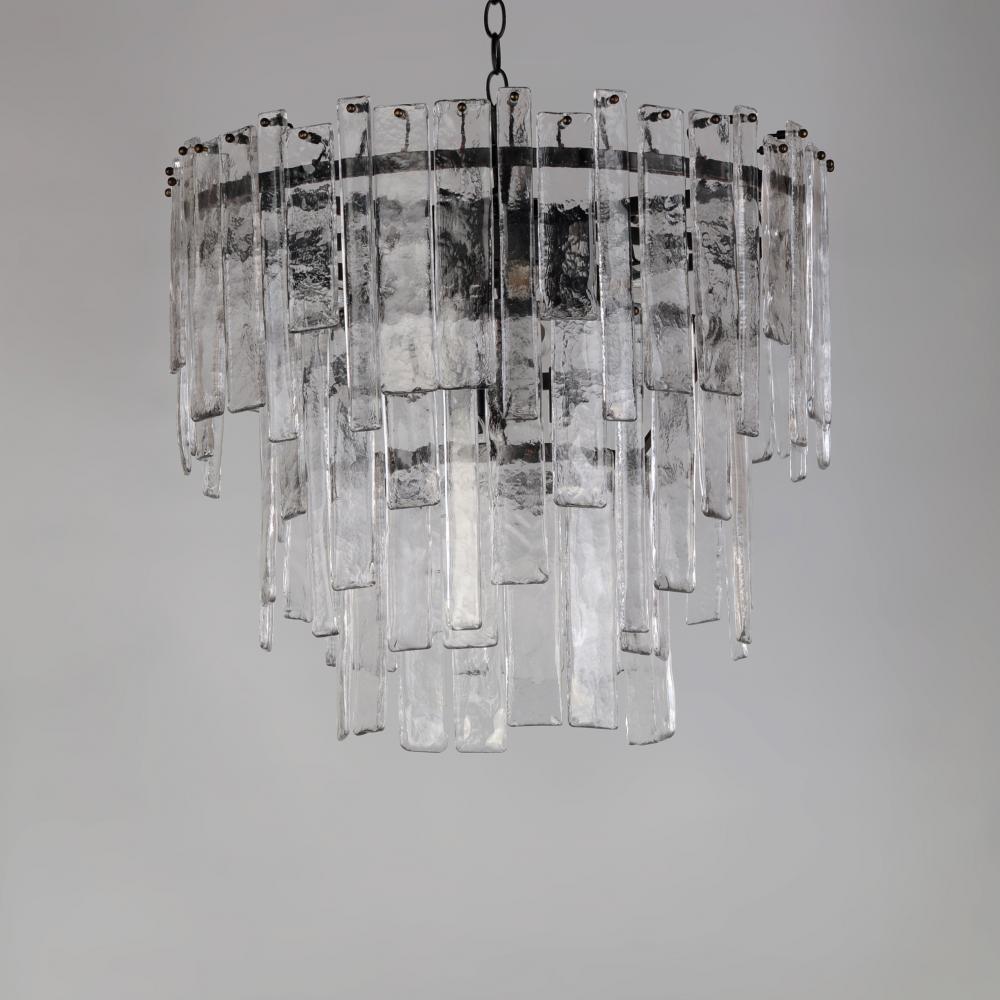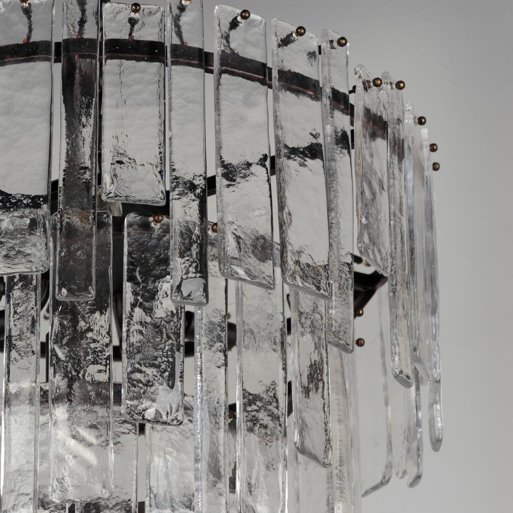 Gracefully flowing molten glass panels with uniquely organic aesthetic encircle rings of rich Darkened Bronze metal or hand-applied Gold Leaf. This refined interpretation of tiered glass pendants exudes warmth and elegance, effortlessly blending a moody am