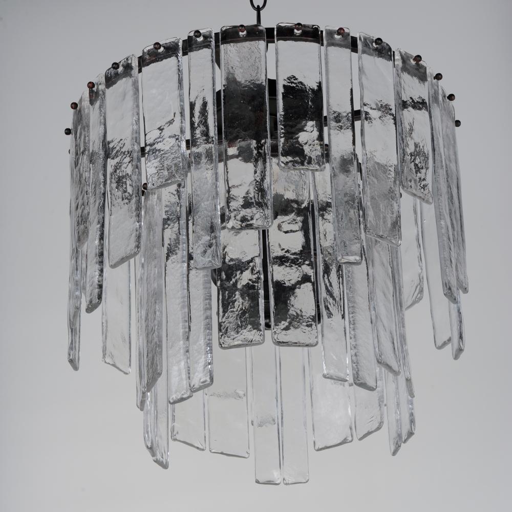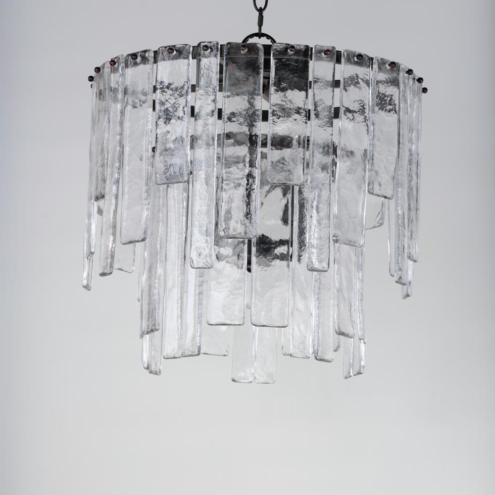 Gracefully flowing molten glass panels with uniquely organic aesthetic encircle rings of rich Darkened Bronze metal or hand-applied Gold Leaf. This refined interpretation of tiered glass pendants exudes warmth and elegance, effortlessly blending a moody am