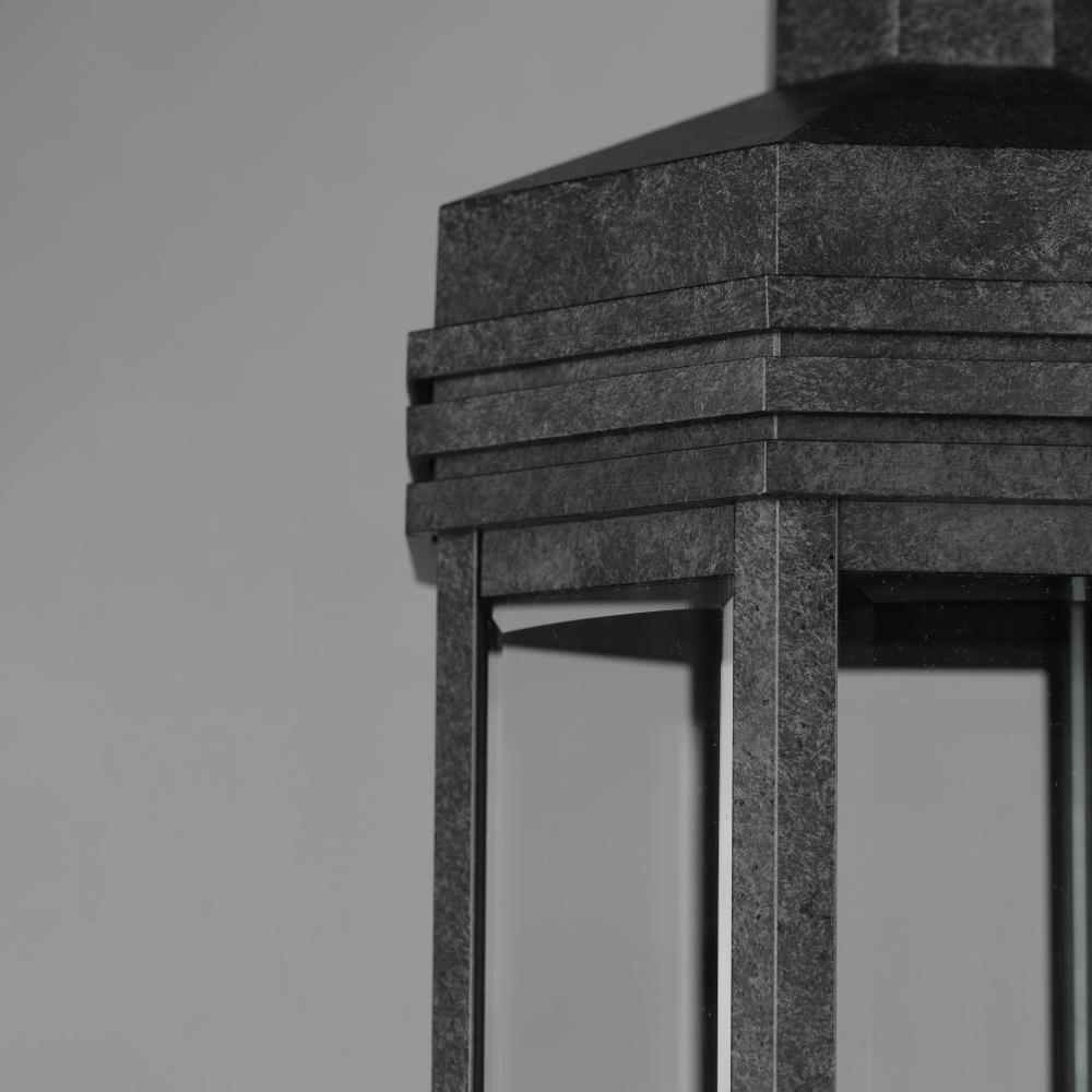 Inspired by the intricate geometric motifs of the iconic architect, the Wright collection of outdoor lighting features a hexagonal frame with tiered louvers along its hood. Beveled at its edges, the Clear glass panes encase the lighting cluster within a ro
