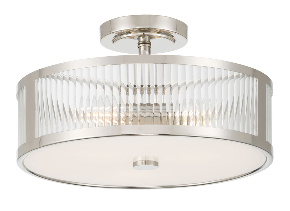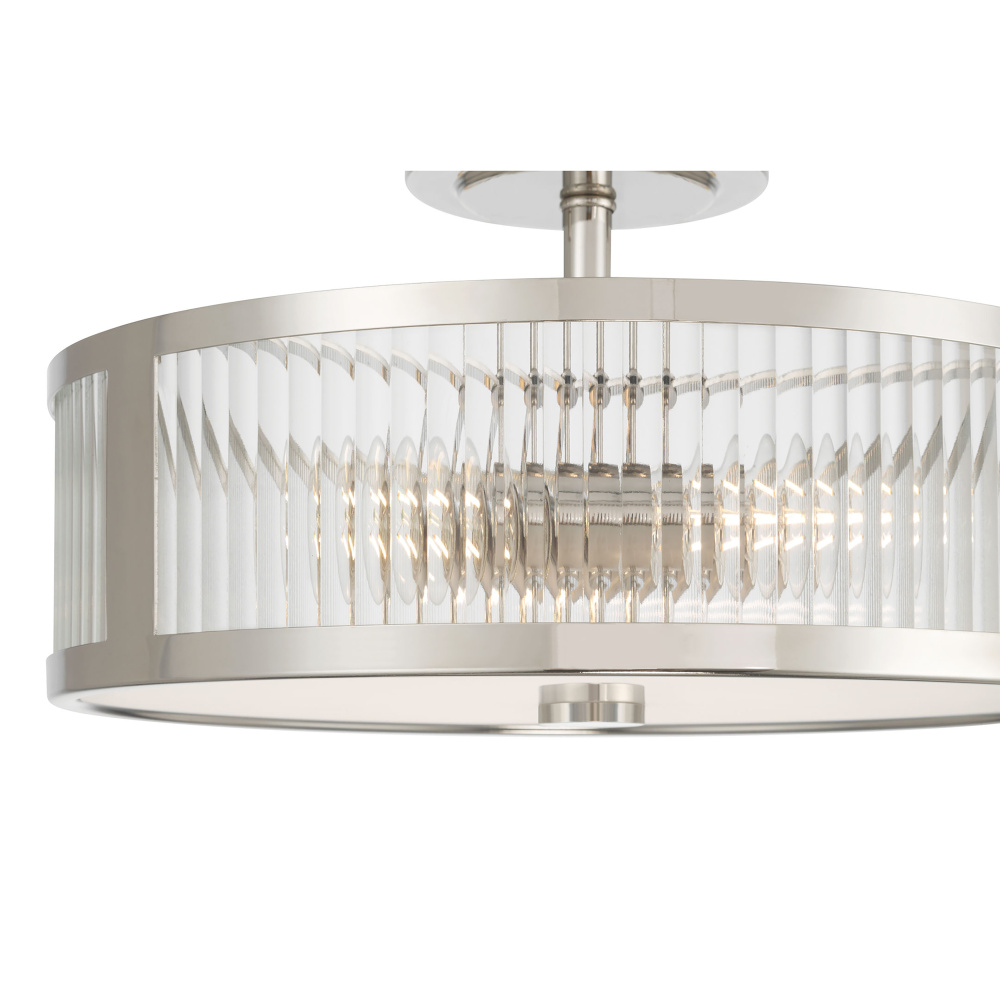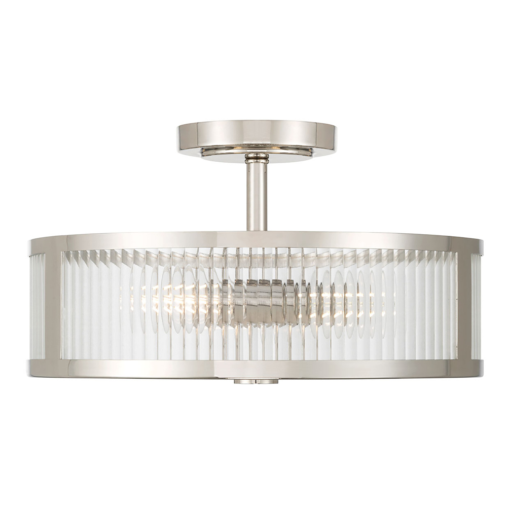 Featuring a Polished Nickel finish with a Clear Ribbed glass shade.
