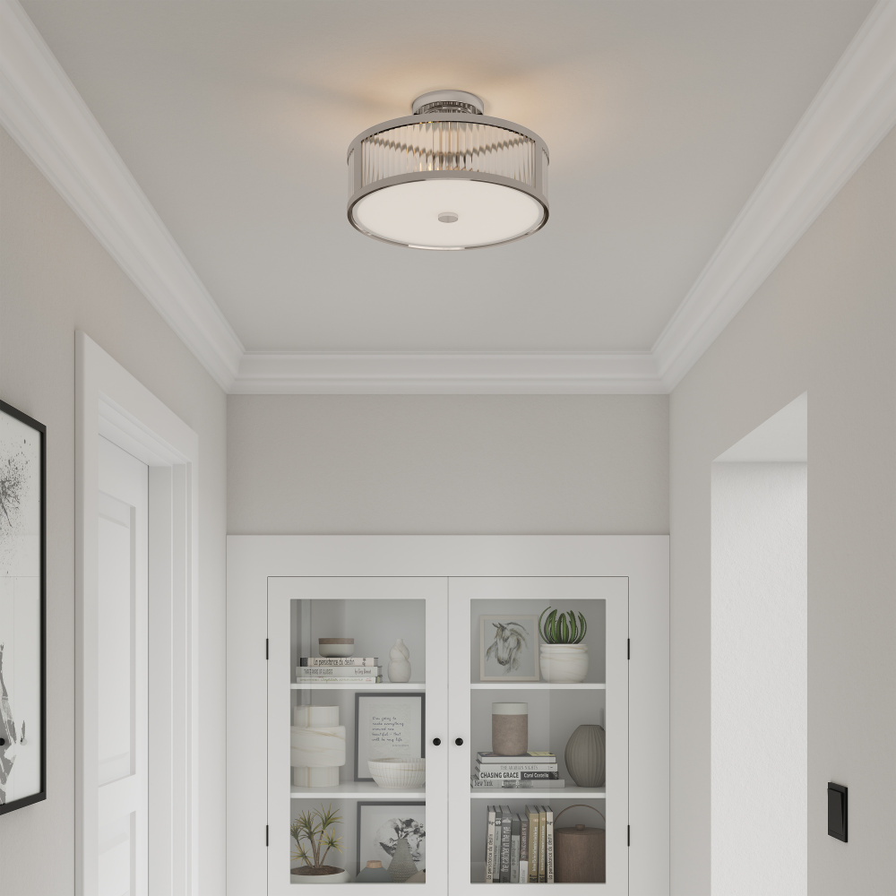 The Ardezia Collection of flush mount and semi-flush mount celling lighting takes on a distinctive flair with gorgeous clear ribbed glass shades creating a unique play of light. The steel, drum shaped fixtures are finished in either matte black, polished nickel or vintage brass and are the perfect complement to any interior from Mid-Century modern to modern transitional while the opaque off-white diffuser provides warm and inviting illumination.