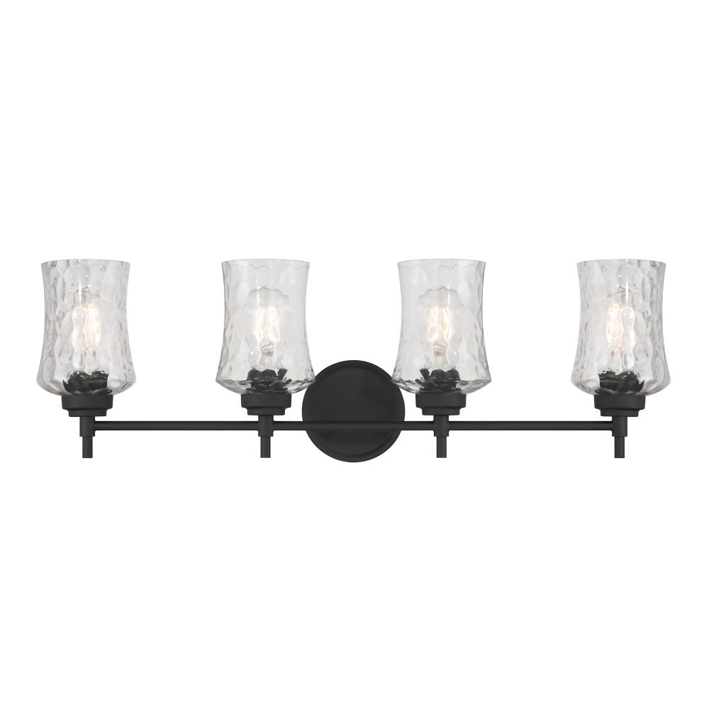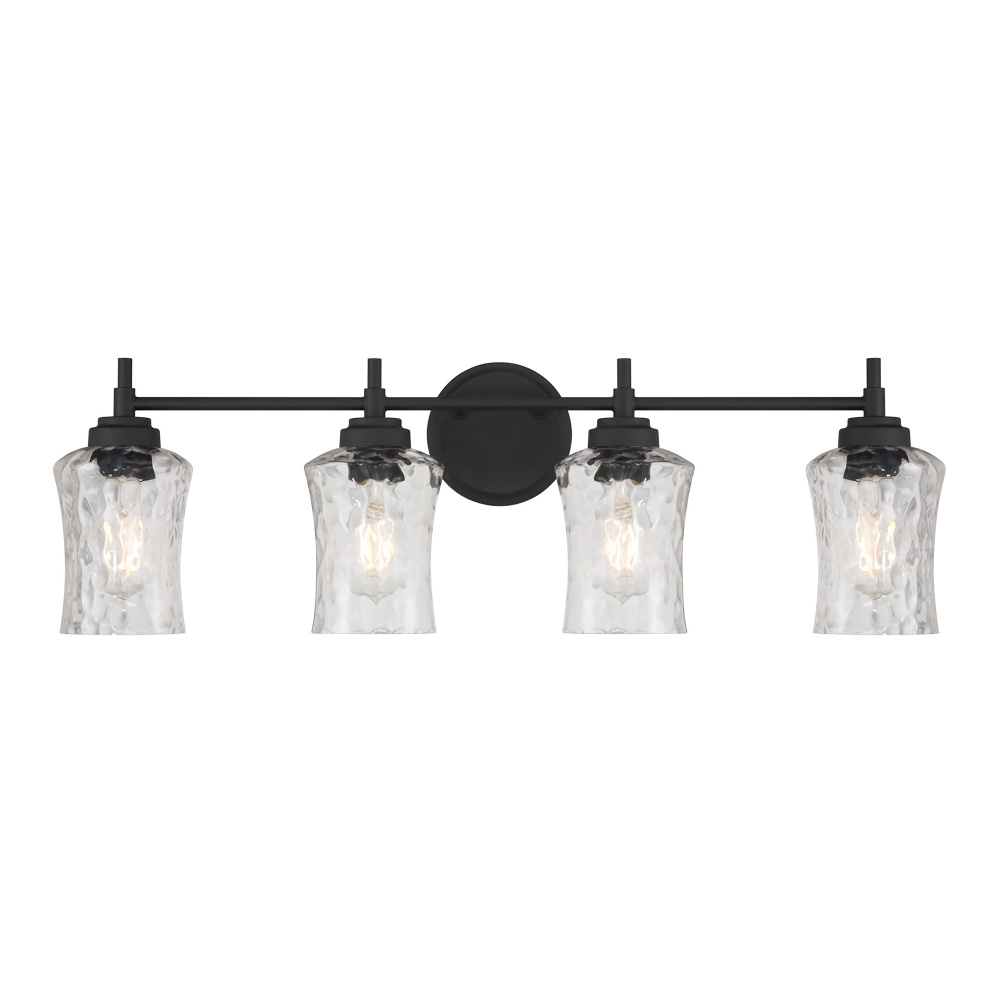 Clear, stone water glass shades emitting a gorgeous, dappled lighting effect provide the Clarvyn Collection with a look of distinction. The graceful lines of the cinched style shades are enhanced by the clean, contemporary lines of the fixtures finished in either matte black or vintage brass. The collection is available as a 1-light sconce; 2, 3 or 4-light vanity, 6-light chandelier, 2-light semi-flush, or 1-light mini-pendant.