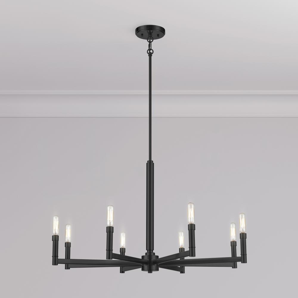 Available in either an 8-light take on the classic wagon style or a 1 design-forward rectangular profile, the Daxley Family of chandelier lighting provides impressive design options. The matte black finish infuses an air of sophistication, and the candle-style bulbs provide the perfect finishing touch. Both refined and bold, this family of fixtures is perfect for dining room or kitchen.