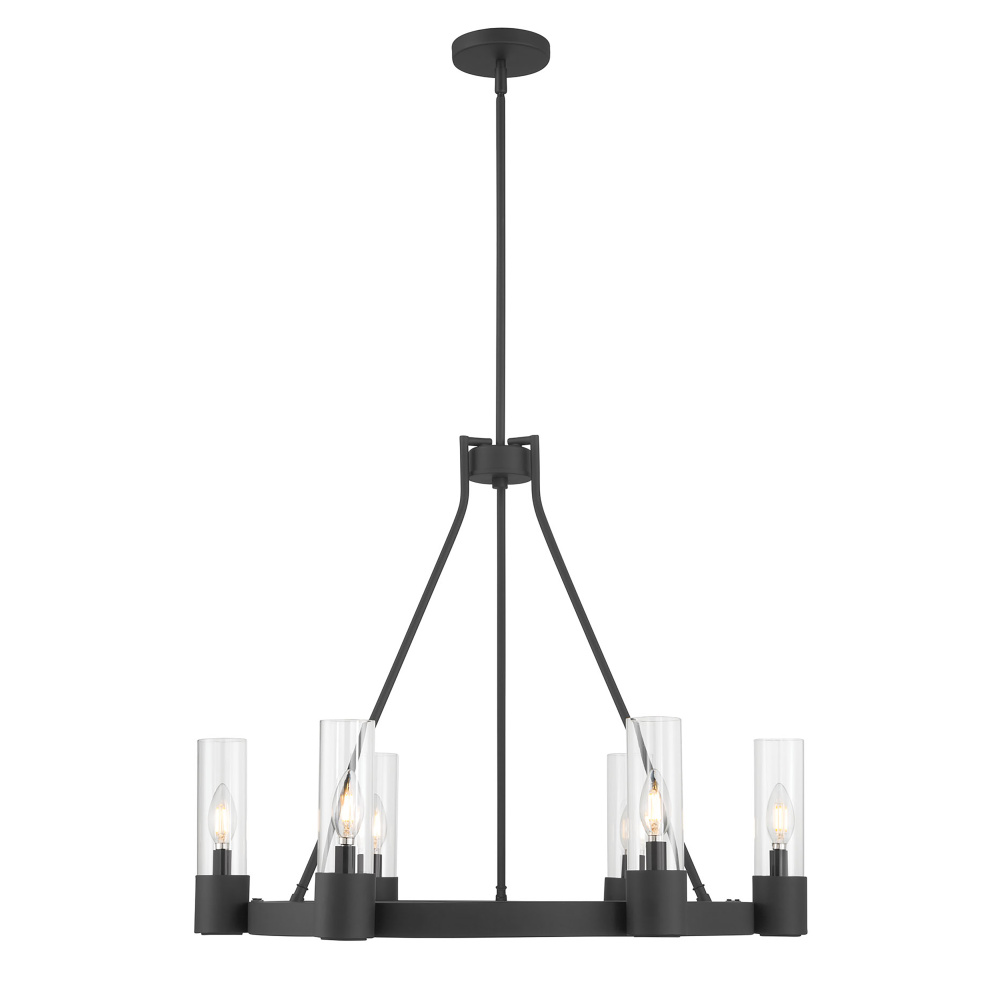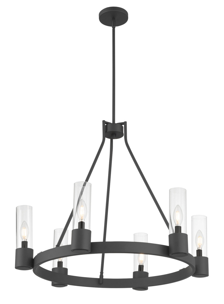 The Gothic design movement is completely reimagined with a modern twist in the Evandrel Collection of chandelier lighting. Available as a 6 or 8-light wagon wheel-style chandelier or 4-light cage-style foyer light with sweeping arches, these steel fixtures are finished in matte black and feature contemporary clear glass shades. The overall effect is a dynamic design statement for any modern transitional interior.