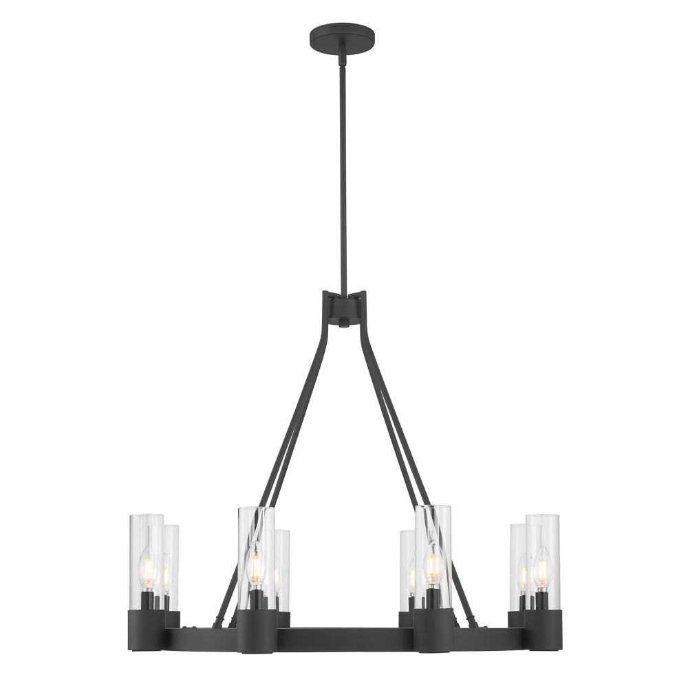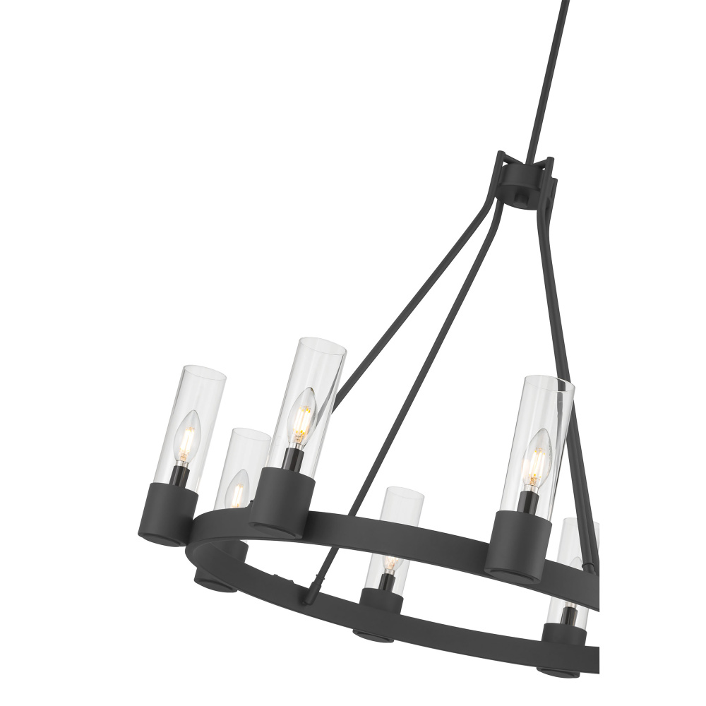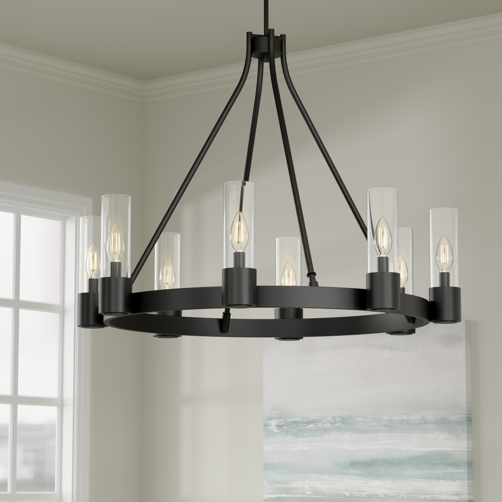 The Gothic design movement is completely reimagined with a modern twist in the Evandrel Collection of chandelier lighting. Available as a 6 or 8-light wagon wheel-style chandelier or 4-light cage-style foyer light with sweeping arches, these steel fixtures are finished in matte black and feature contemporary clear glass shades. The overall effect is a dynamic design statement for any modern transitional interior.