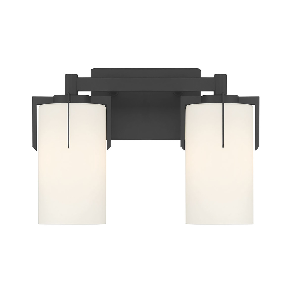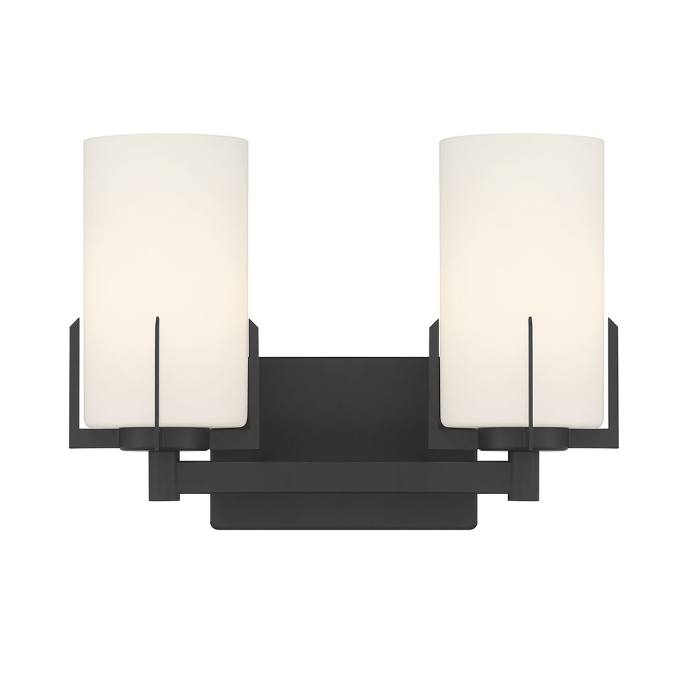 Featuring a Matte Black finish with White Frosted glass shades.