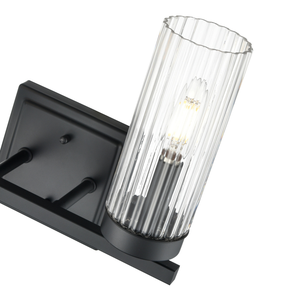The Iversen Family of vanity and sconce lighting is distinguished by a blend of sleek lines accentuated with post-industrial style hardware. From the square backplate with inset design, to the sparkling clear reeded glass shades, the result is a dazzling play of light perfect for bath or hallway. These exceptional fixtures are available as 1-light sconces and 2-, 3-, or 4-light vanity lamps and are finished in brushed nickel, chrome, matte black, or vintage brass.