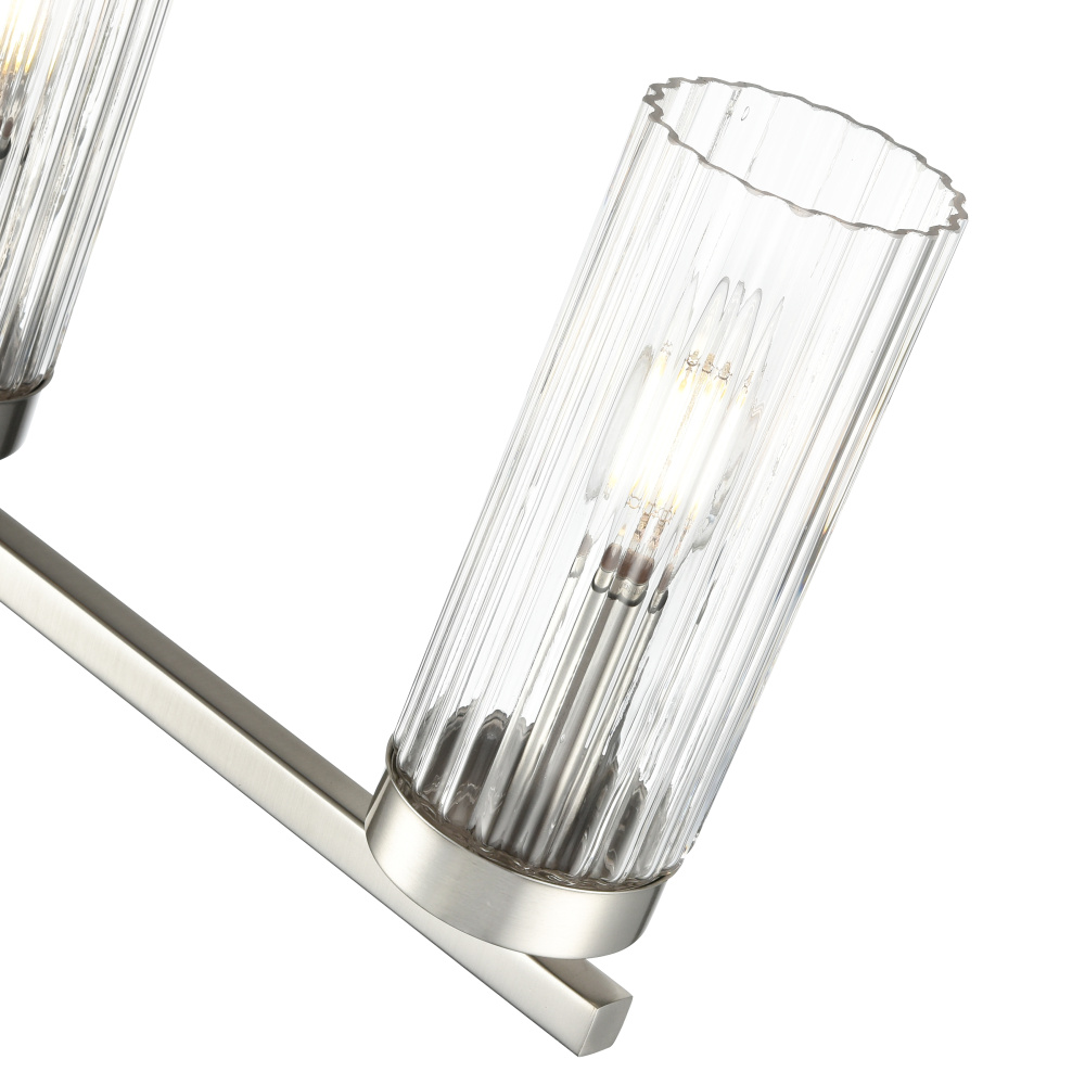 The Iversen Family of vanity and sconce lighting is distinguished by a blend of sleek lines accentuated with post-industrial style hardware. From the square backplate with inset design, to the sparkling clear reeded glass shades, the result is a dazzling play of light perfect for bath or hallway. These exceptional fixtures are available as 1-light sconces and 2-, 3-, or 4-light vanity lamps and are finished in brushed nickel, chrome, matte black, or vintage brass.