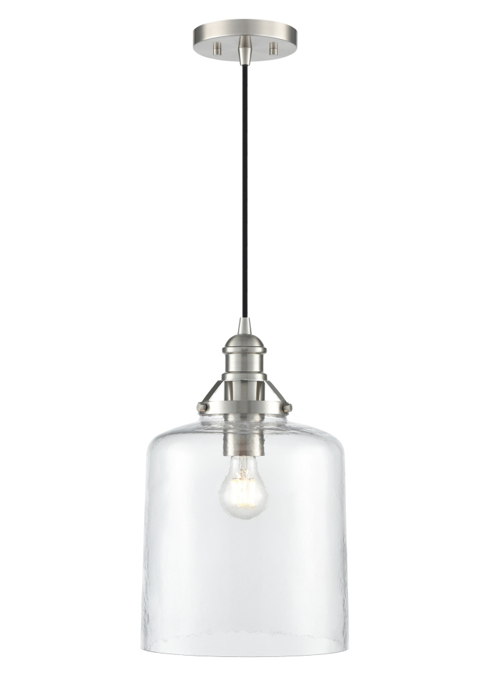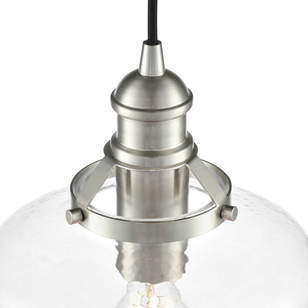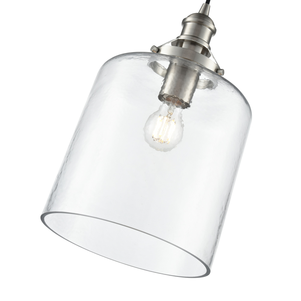 The Khrisa Family of pendant lighting combines modern styling with distinctive shades to create a lighting masterpiece perfect for the kitchen, dining area, or entryway. The stylized 1-light fixtures, finished in brushed nickel, polished nickel, vintage brass, or matte black, feature post-industrial styled hardware, creating a contemporary profile. The gorgeous, hammered glass shades are available in either a drum or bell-shaped silhouette and create a unique dappled lighting effect.