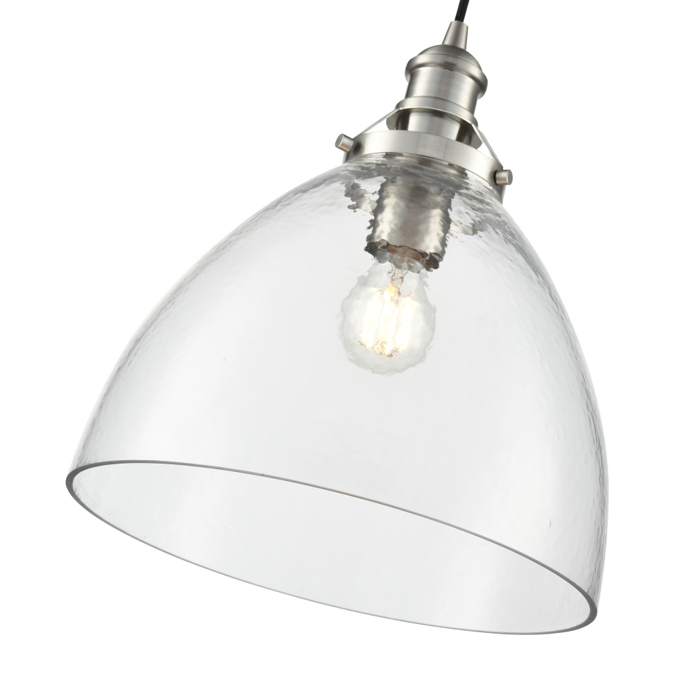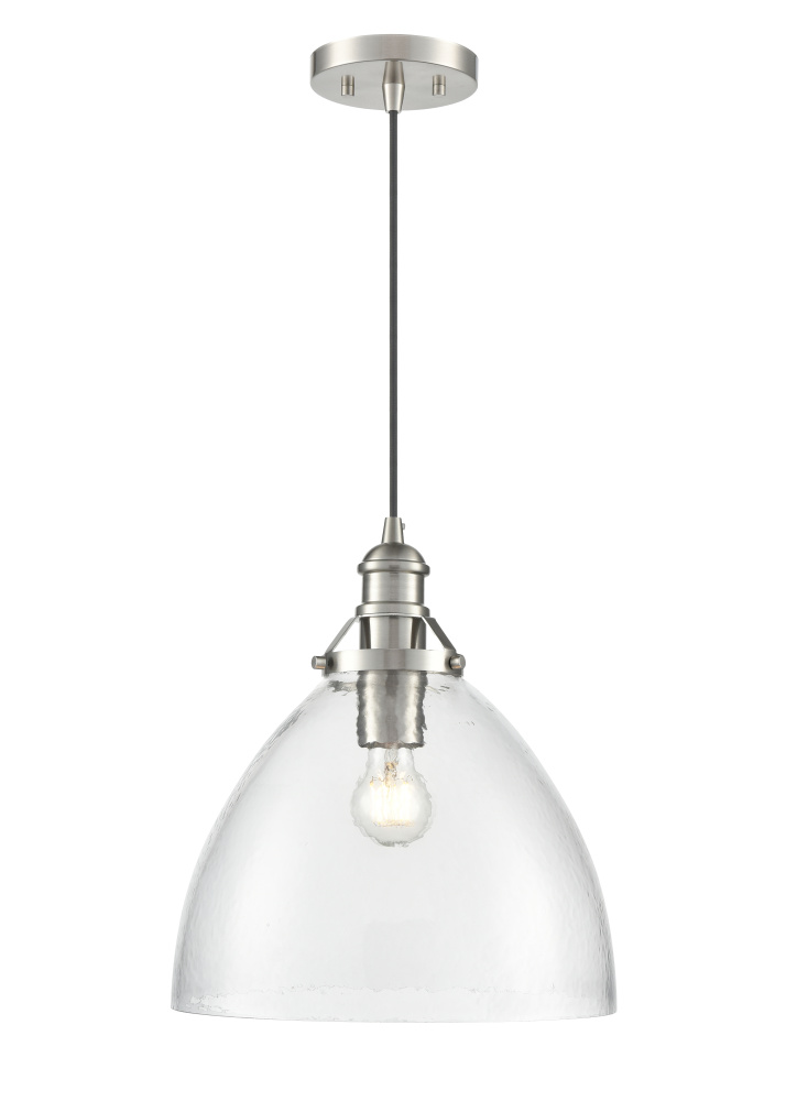 The Khrisa Family of pendant lighting combines modern styling with distinctive shades to create a lighting masterpiece perfect for the kitchen, dining area, or entryway. The stylized 1-light fixtures, finished in brushed nickel, polished nickel, vintage brass, or matte black, feature post-industrial styled hardware, creating a contemporary profile. The gorgeous, hammered glass shades are available in either a drum or bell-shaped silhouette and create a unique dappled lighting effect.