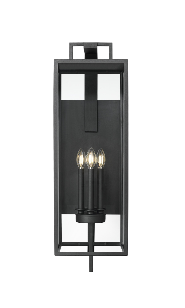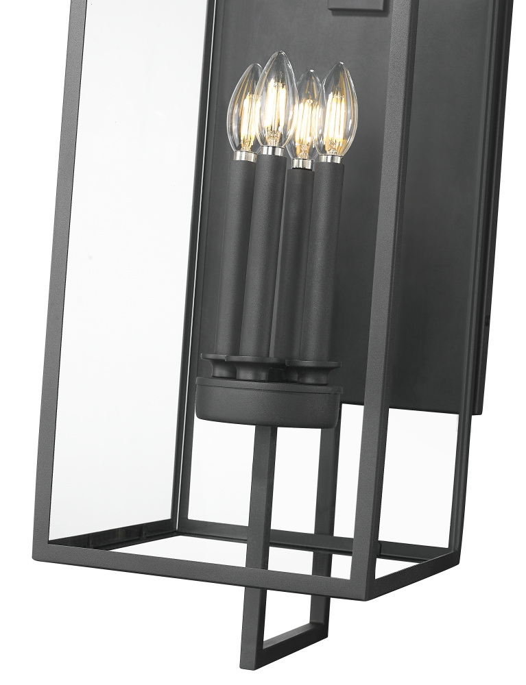 A contemporary interpretation of Victorian Gothic design, the Lamont Collection of outdoor lighting is designed to make a bold visual impact on any entryway. The succinct lines of the steel framework create an elongated, multi-dimensional fixture finished in durable textured black. The partial, clear glass panels reveal classic style candles in 1, 2, 3, and 4-light options. The fixture’s overall profile melds perfectly with any modern exterior or adds a dynamic twist to classic architectural styles.