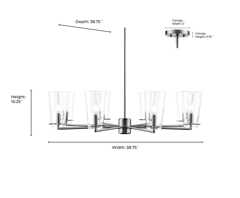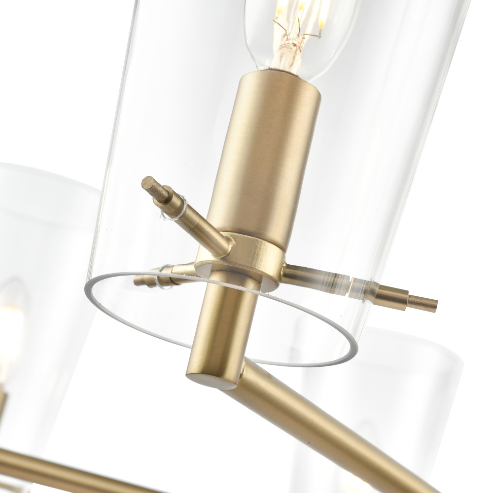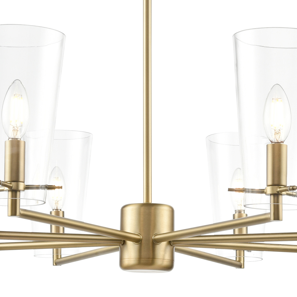 Clean geometric lines produce a luxurious look for the Maccan Family of interior lighting. These sophisticated fixtures, available as a 5- or 8-light chandelier and 1-light pendant, are finished in classic vintage brass. The crystal-clear glass shades and the artistically crafted hardware work in perfect harmony to create a cosmopolitan appearance. The overall effect is the perfect complement for any interior, from ultra-modern to vintage chic.