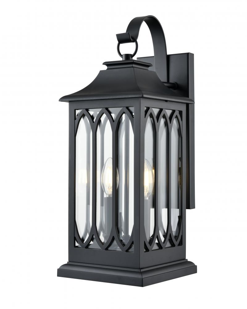 Exquisite metalwork creates wonderful light play for the Mallorey Family of outdoor lighting. The aluminum housing, finished in powder coated black, is punctuated with a modern spin on Gothic-style arches and the traditional hook-and-arm profile. The fixtures are available as 1-, 2-, and 3-light sconce, 3-light pendant, or 3-light post, and create a dramatic effect across any exterior.