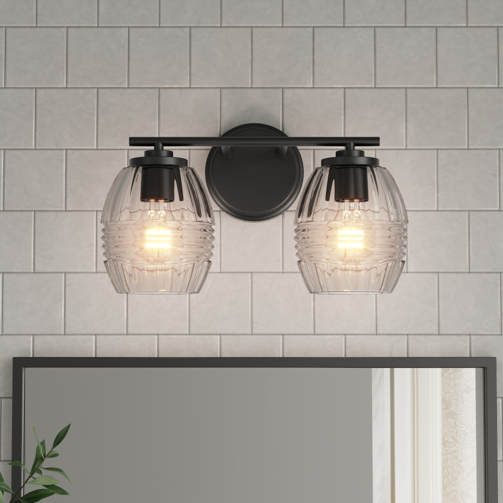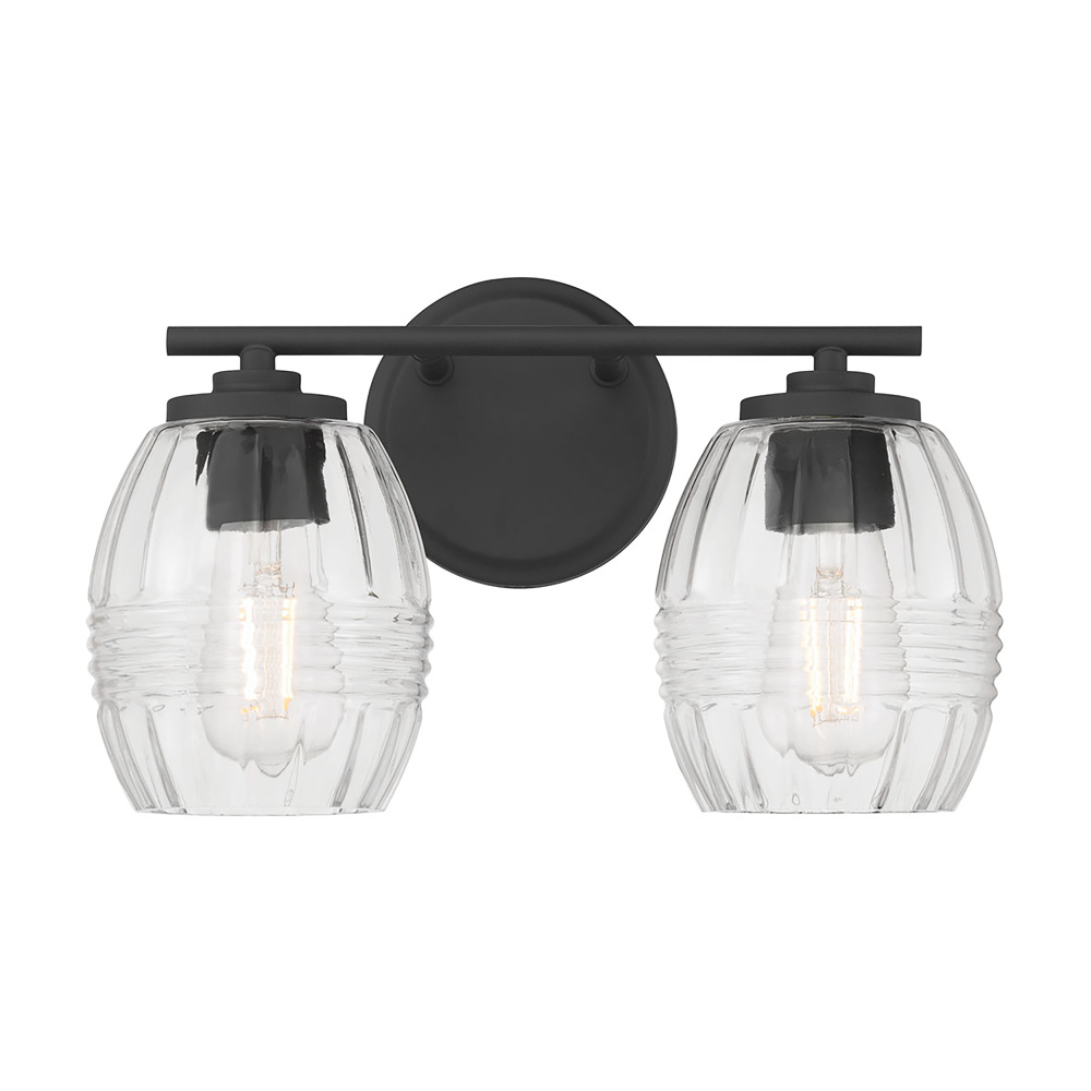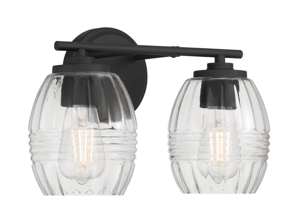 Barrel-shaped glass shades with horizontal ribbing create an attractive play of light in the Miravelle Collection of vanity and bath lighting. Clean linear lines and round minimalist backplates complete the look and are finished in either matte black or vintage brass. This exquisite Collection includes a 1-light mini-pendant, 3-light pendant, 1-light wall sconce and 2, 3, or 4-light vanity fixtures for the perfect task light.