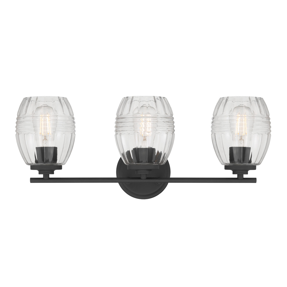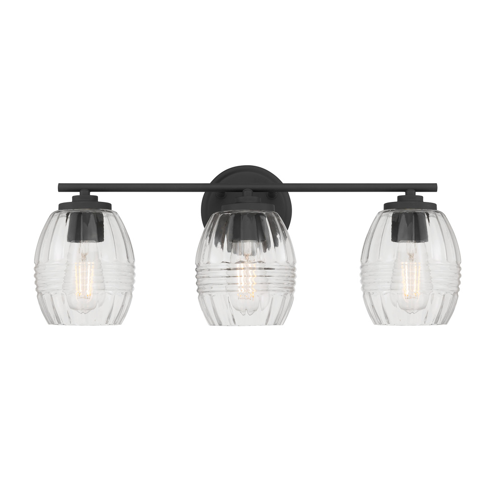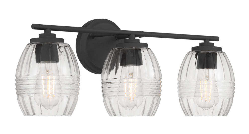 Barrel-shaped glass shades with horizontal ribbing create an attractive play of light in the Miravelle Collection of vanity and bath lighting. Clean linear lines and round minimalist backplates complete the look and are finished in either matte black or vintage brass. This exquisite Collection includes a 1-light mini-pendant, 3-light pendant, 1-light wall sconce and 2, 3, or 4-light vanity fixtures for the perfect task light.