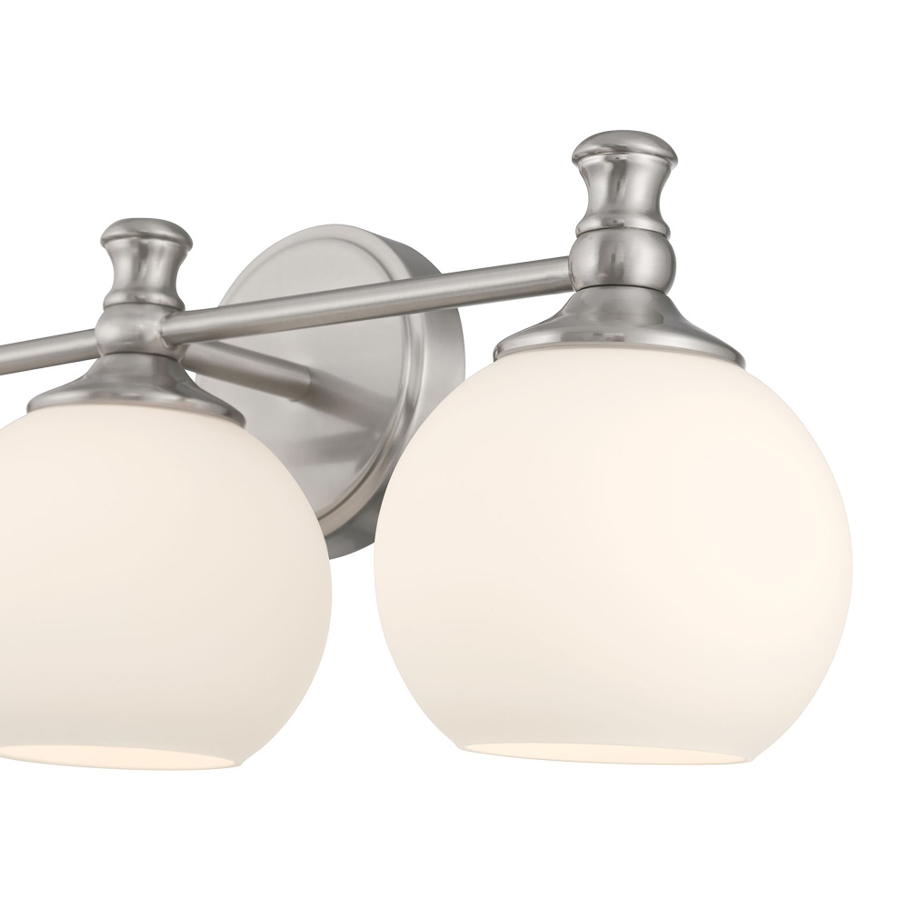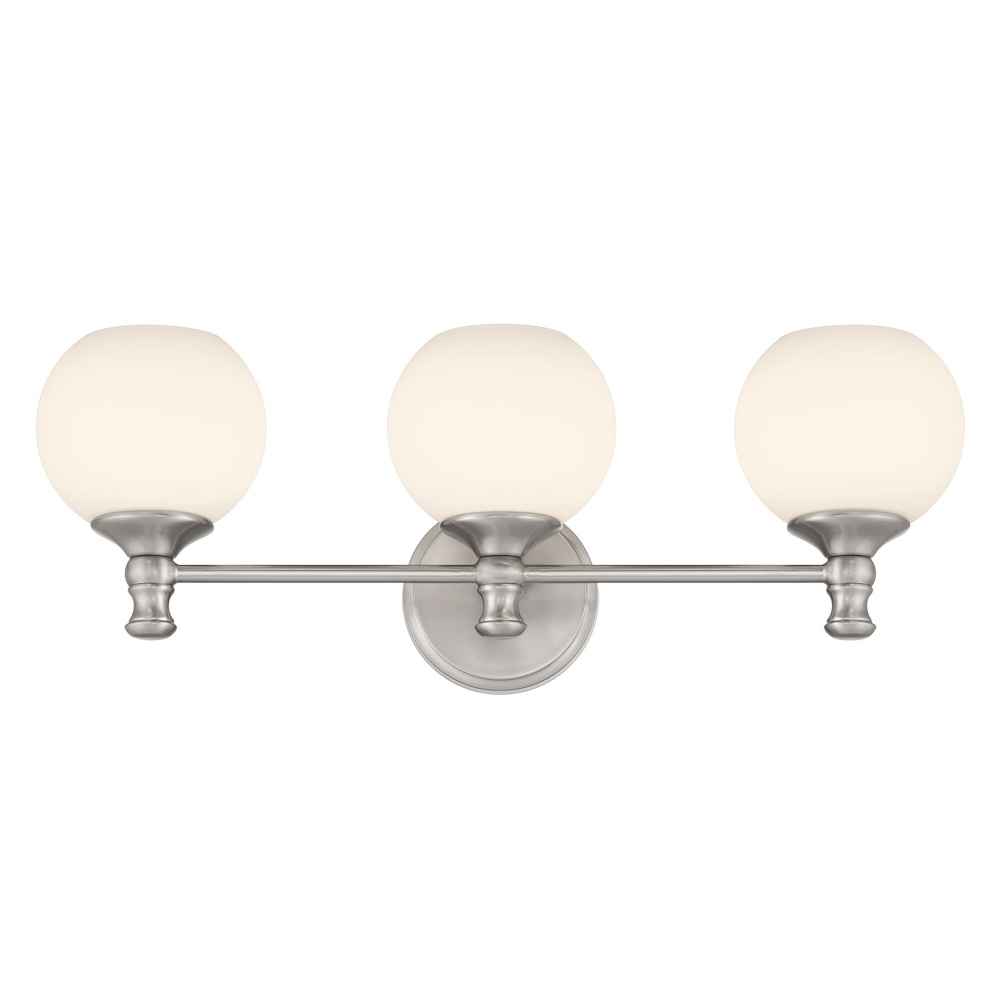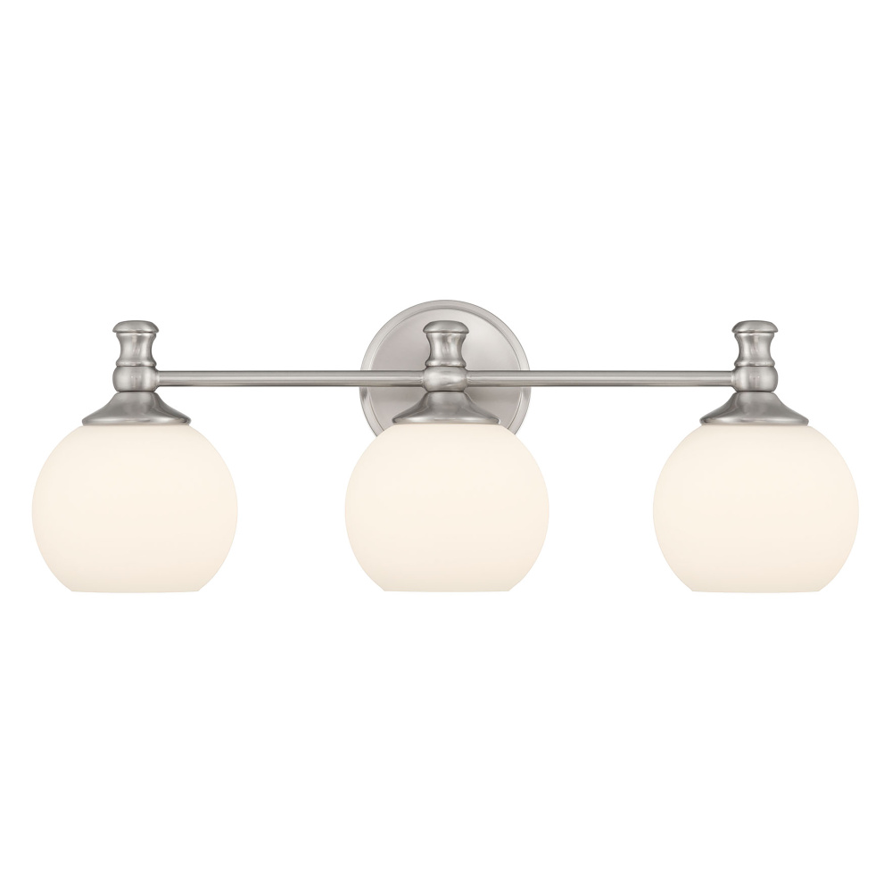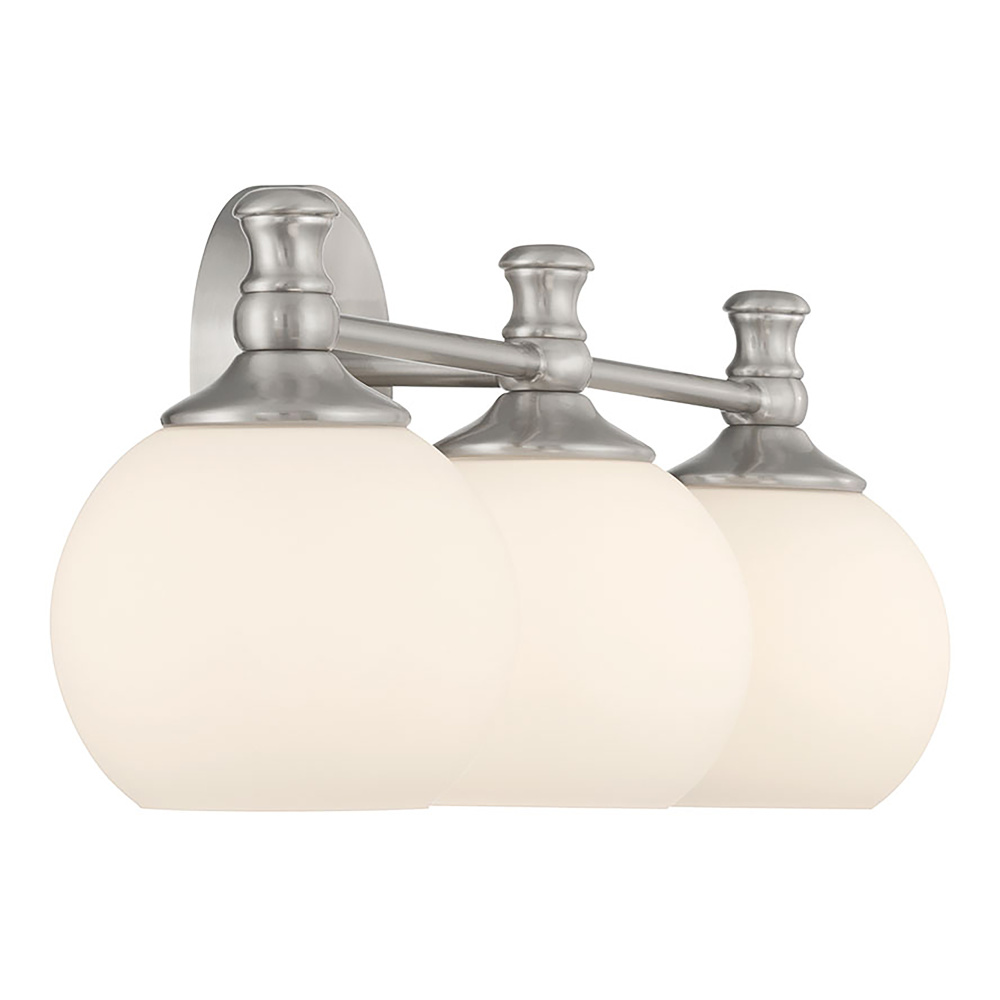 The Orlisse Collection of bath lighting perfectly melds classic Edwardian styling with contemporary simplicity. Opaque, etched opal globes suspend gracefully from fixtures finished in brushed nickel, matte black, or vintage brass and are topped with antique style finials. The fixtures are available as a 1-light wall sconce and 2 or 3-light vanity bar with round beveled backplates.