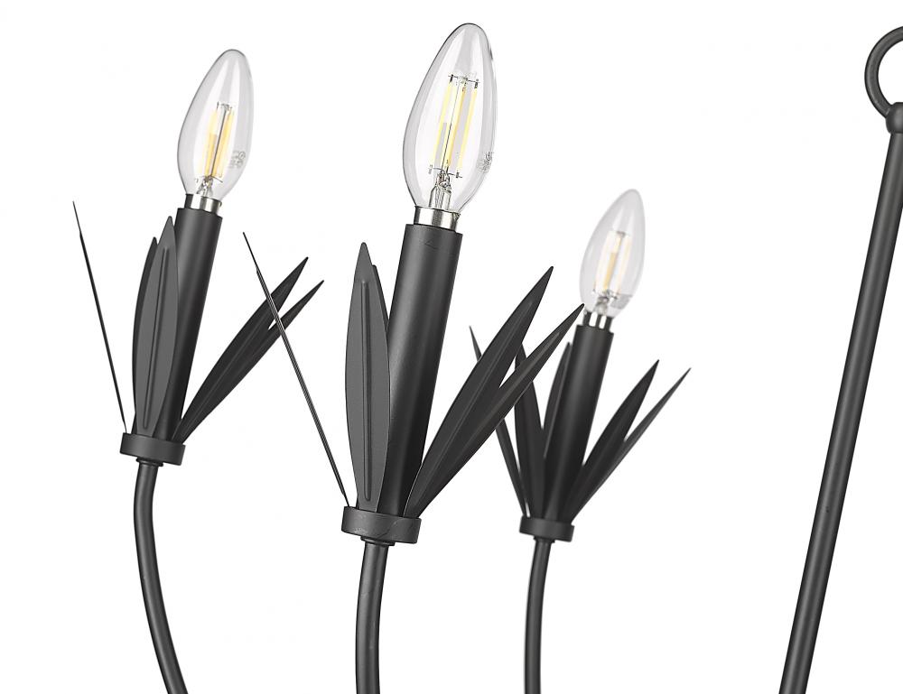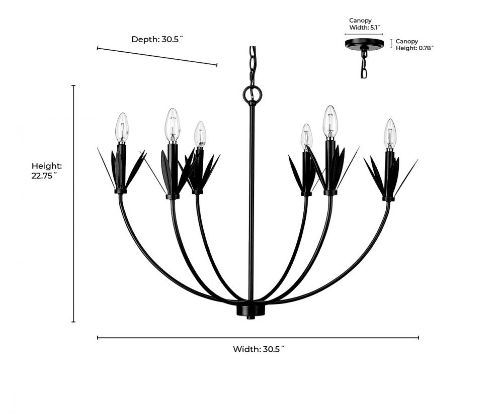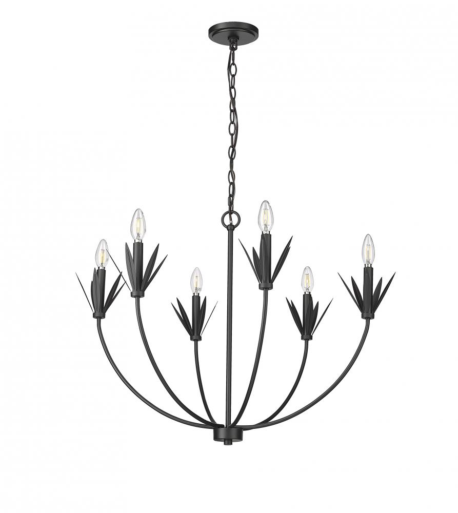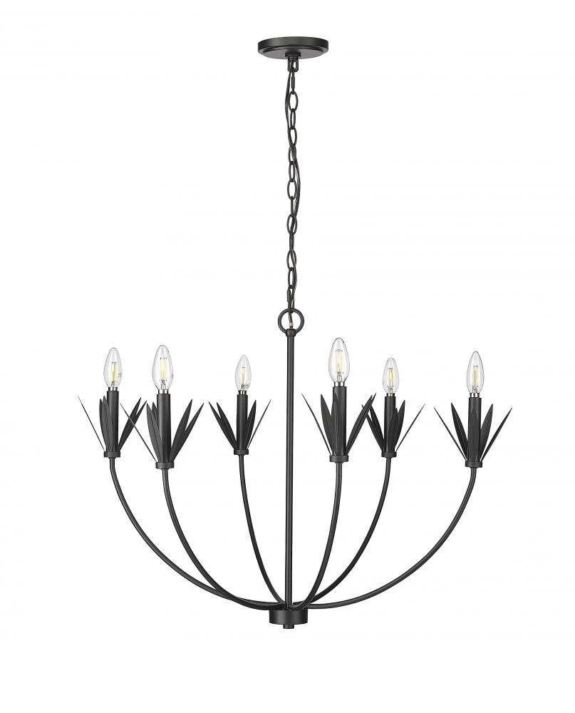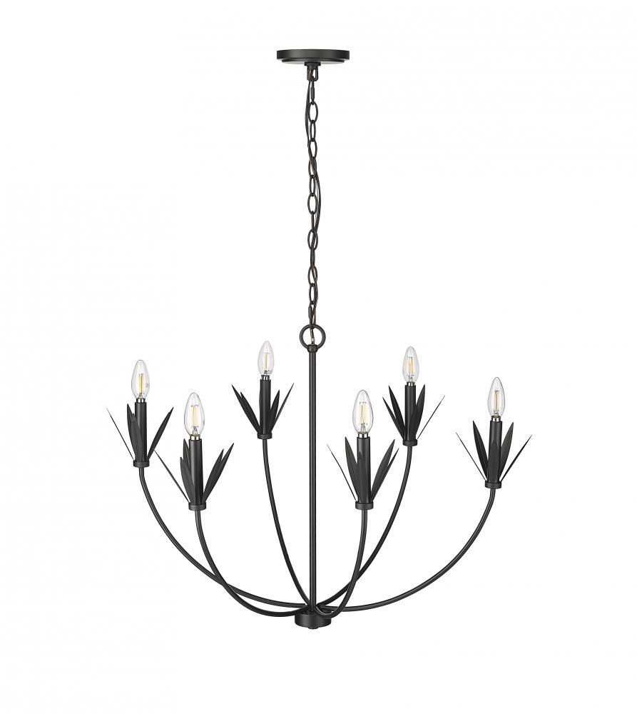 The Primrose Collection is defined by chic, linear leaf-shaped flourishes punctuating the fount and candle cups of these chandeliers. The sweeping, gentle curves and modern take on a botanic profile create a joyous effect for any gathering room from farmhouse to penthouse. The fixtures are available in either matte black or textured white with 6-light and 8-light options.