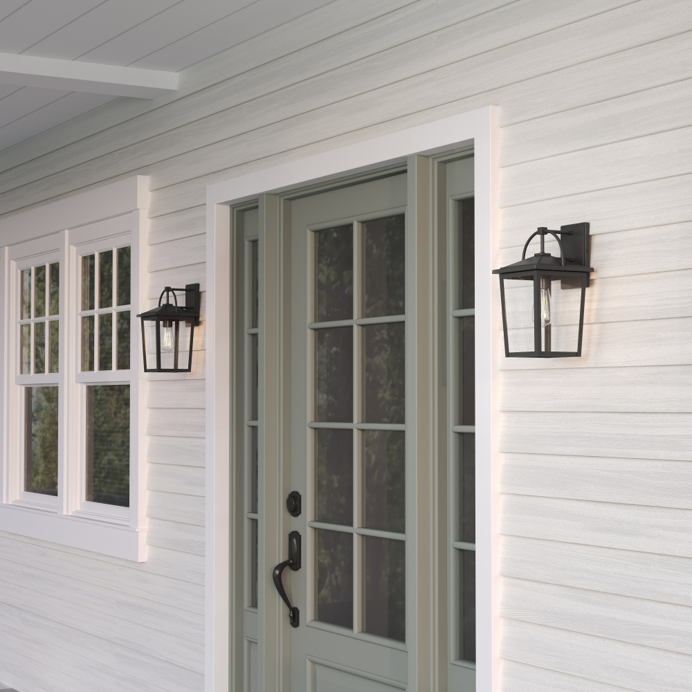 The Strathden Collection of exterior lighting is distinguished by its playful take on antique handheld lanterns. The oversized handle arcs gracefully over the classic shade perfectly framing the clear glass panels. Available as 1 or 2-light outdoor sconce, 2-light post and 2-light pendant, these classic fixtures are finished in powder coat black and create the perfect welcoming light from driveway to entryway.