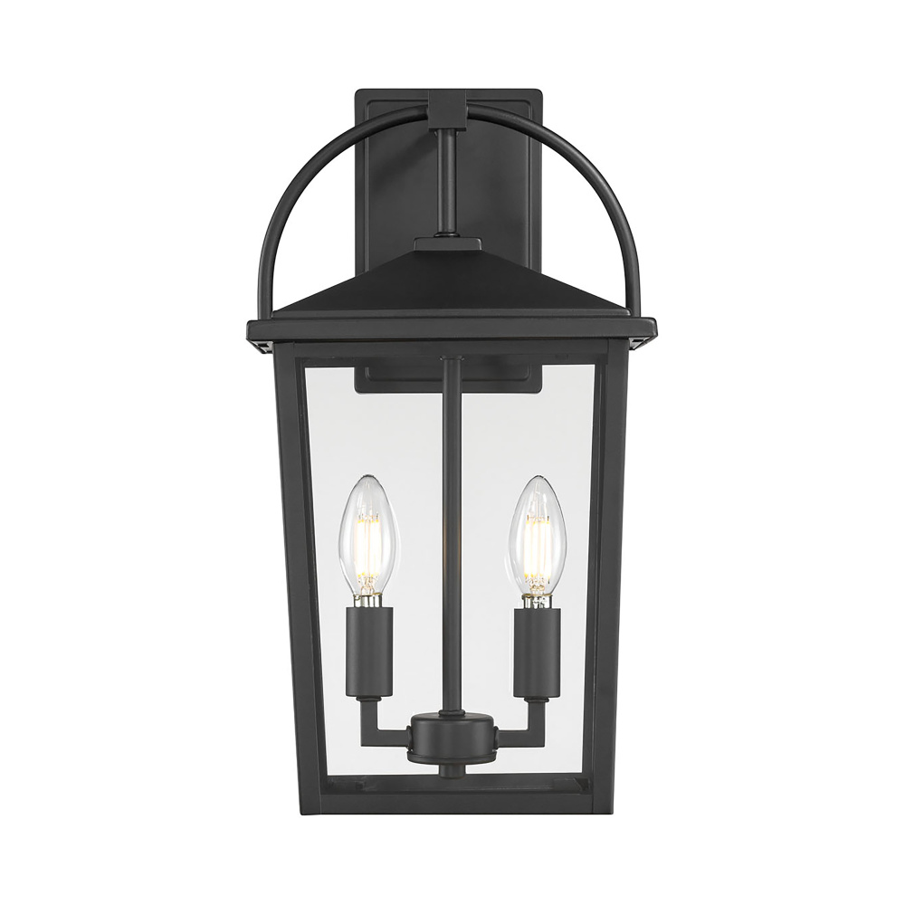 The Strathden Collection of exterior lighting is distinguished by its playful take on antique handheld lanterns. The oversized handle arcs gracefully over the classic shade perfectly framing the clear glass panels. Available as 1 or 2-light outdoor sconce, 2-light post and 2-light pendant, these classic fixtures are finished in powder coat black and create the perfect welcoming light from driveway to entryway.