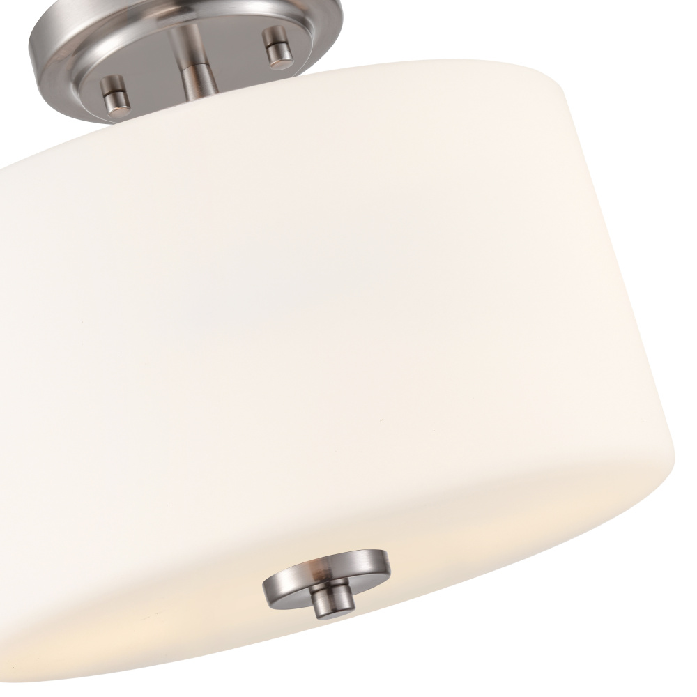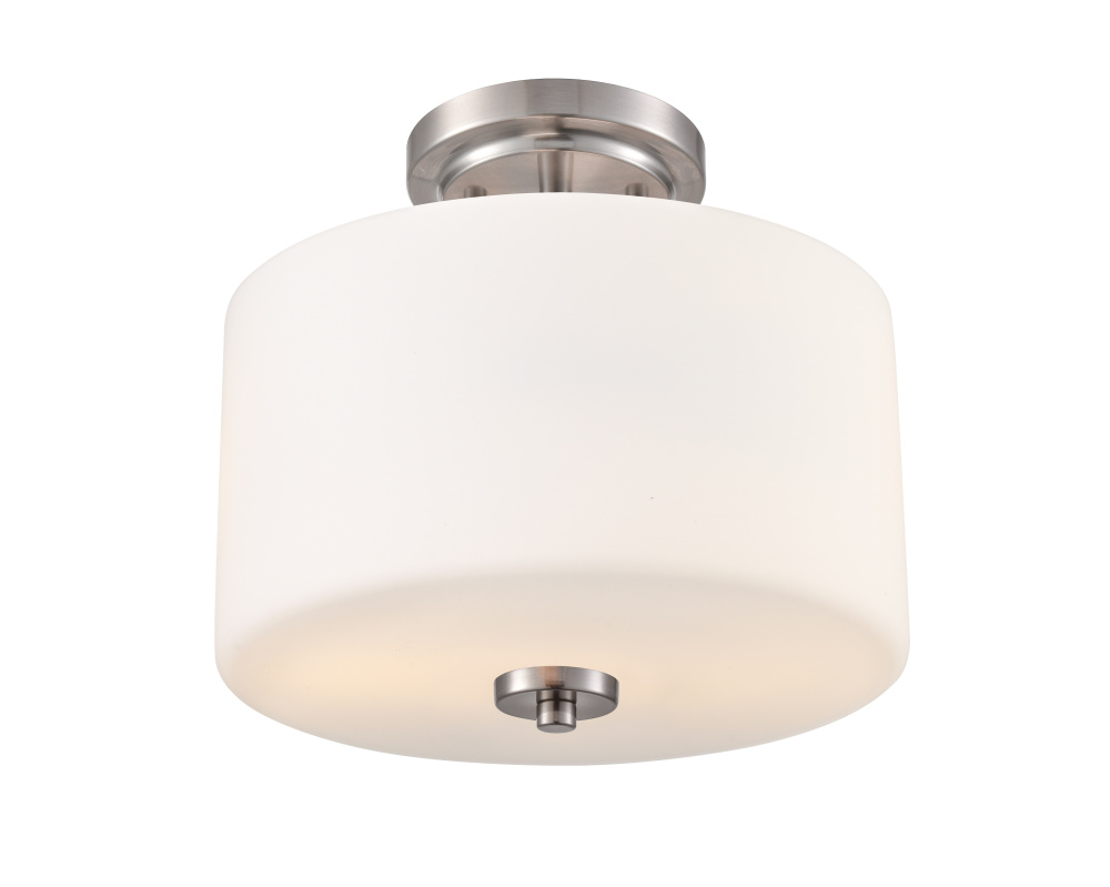 This fixture features a brushed nickel finish and etched opal glass shade.