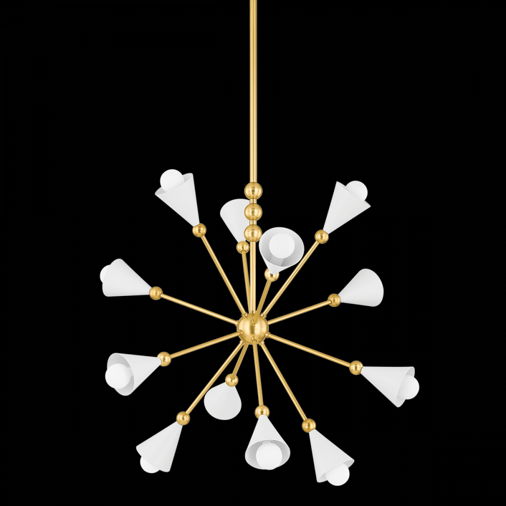 The flamboyant sputnik design of the Hikari chandelier bursts with confidence. Casting light in all directions, twelve soft white conical shades complete the Aged Brass satellite structure. Small spheres dot each arm like jewels, adding a decorative note to this mid-century modern revival. Hikari is also available as a wall sconce and a 4 or 6-light chandelier. Part of our Dabito x Mitzi Tastemakers collection.