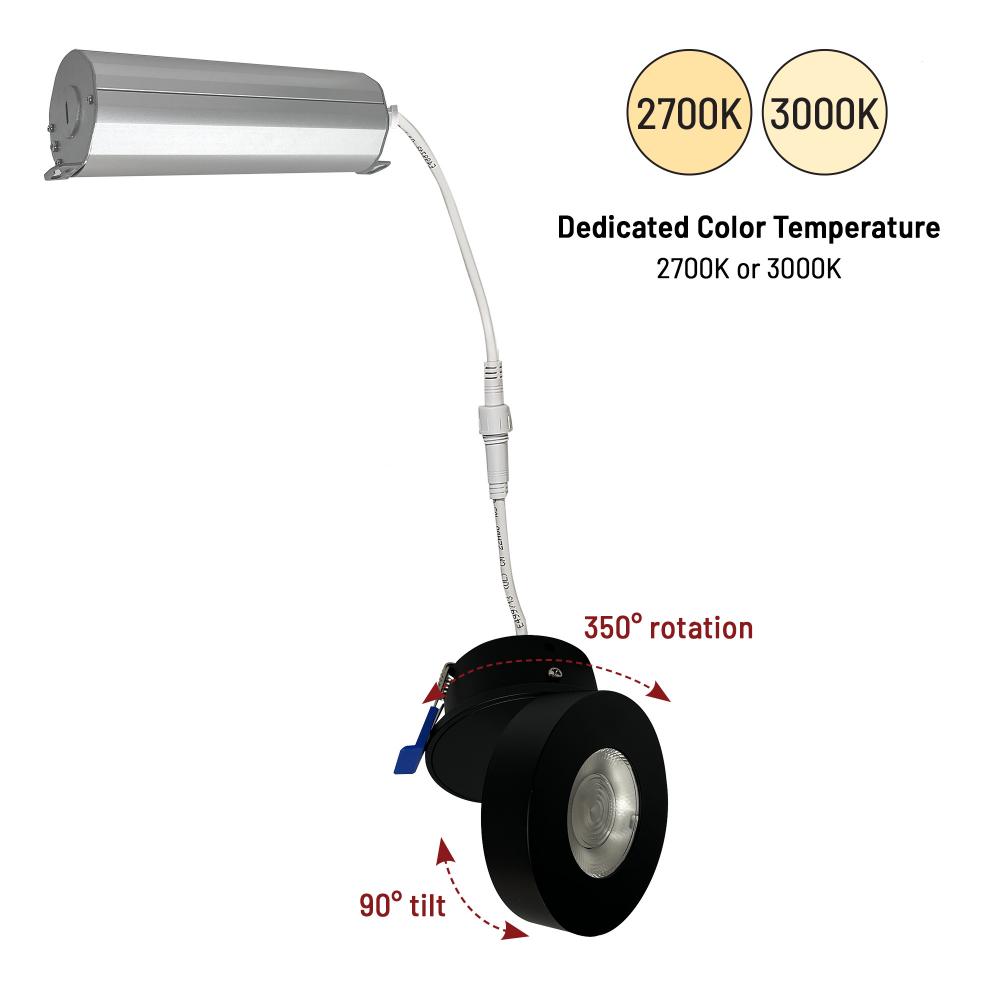 2" M-Wave adjustable can-less LED downlights are unique and functional. Luminaires extend up to 90° and can be rotated 350° to illuminate any surface. Can-less downlights are easy to install in new construction or remodel applications. Adjustment: 90° tilt / 350° rotation Input Voltage: 120V Lumens / Wattage: 750lm / 9W Optic: 45° Narrow Flood included (spot and narrow spot optics available) Color Temperature: 2700K Color Rendering Index: 90+ CRI Dimming: Triac or ELV Finish: Matte Black Listing: cULus Listed for Wet Locations