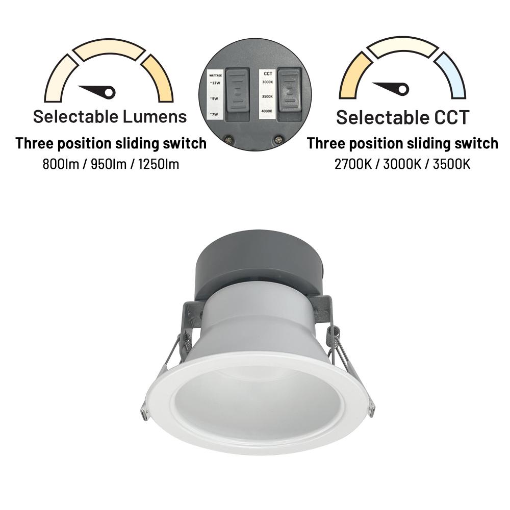 4" Quartz luminaires are architectural and commercial-grade LED high-lumen downlights. Each luminaire includes two tunable switches: Selectable Lumens allows the end user to determine the wattage input, and Selectable CCT allows changing the color temperature appearance. Downlights include two tension steel spring clips, which allow the luminaires to be installed without any frame-in or housing for easy installation. Rating: IC Input Voltage: 120-277VAC Lumens / Wattage: Selectable Lumens (800lm / 7W; 950lm / 9W; 1250lm / 12W) Color Temperature: Selectable CCT (3000K / 3500K / 4000K) Dimming: 0-10V Finish: White Accessories: New construction frame-in (NQZ2-4R-F) or Reflector inserts (NQZ-41REFL) Emergency: Remote emergency battery ordered separately (NEPK-20LEDUNV) Listing: cETLus Listed for Wet Locations