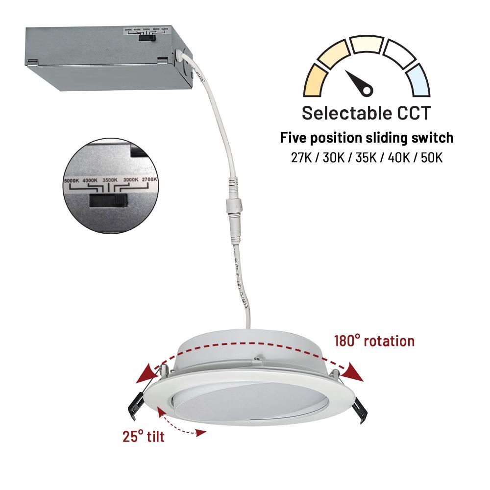 6" FLIN adjustable can-less LED downlights feature two-axis rotation with 25° tilt and 180° rotation. Can-less downlights are easy to install in new construction or remodel applications. Luminaires include a selectable color temperature switch located on the junction box of each luminaire with a quick connect that allows for easy disconnect and mounting in the ceiling. Adjustment: 25° tilt / 180° rotation Input Voltage: 120V Lumens / Wattage: 1100lm / 13.5W Color Temperature: Selectable CCT (27K/30K/35K/40K/50K) Color Rendering Index: 90+ CRI Dimming: Triac or ELV Finish: Matte Powder White Listing: cETLus Listed for Wet Locations