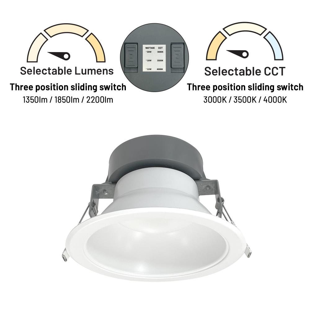 6" Quartz luminaires are architectural and commercial-grade LED high-lumen downlights. Each luminaire includes two tunable switches: Selectable Lumens allows the end user to determine the wattage input, and Selectable CCT allows changing the color temperature appearance. Downlights include two tension steel spring clips, which allow the luminaires to be installed without any frame-in or housing for easy installation. Rating: IC Input Voltage: 120-277VAC Lumens / Wattage: Selectable Lumens (1350lm / 12W; 1850lm / 16W; 2200lm / 20W) Color Temperature: Selectable CCT (3000K / 3500K / 4000K) Dimming: 0-10V Finish: White Accessories: New construction frame-in (NQZ2-6R-F) or Reflector inserts (NQZ-61REFL) Emergency: Remote emergency battery ordered separately (NEPK-20LEDUNV) Listing: cETLus Listed for Wet Locations