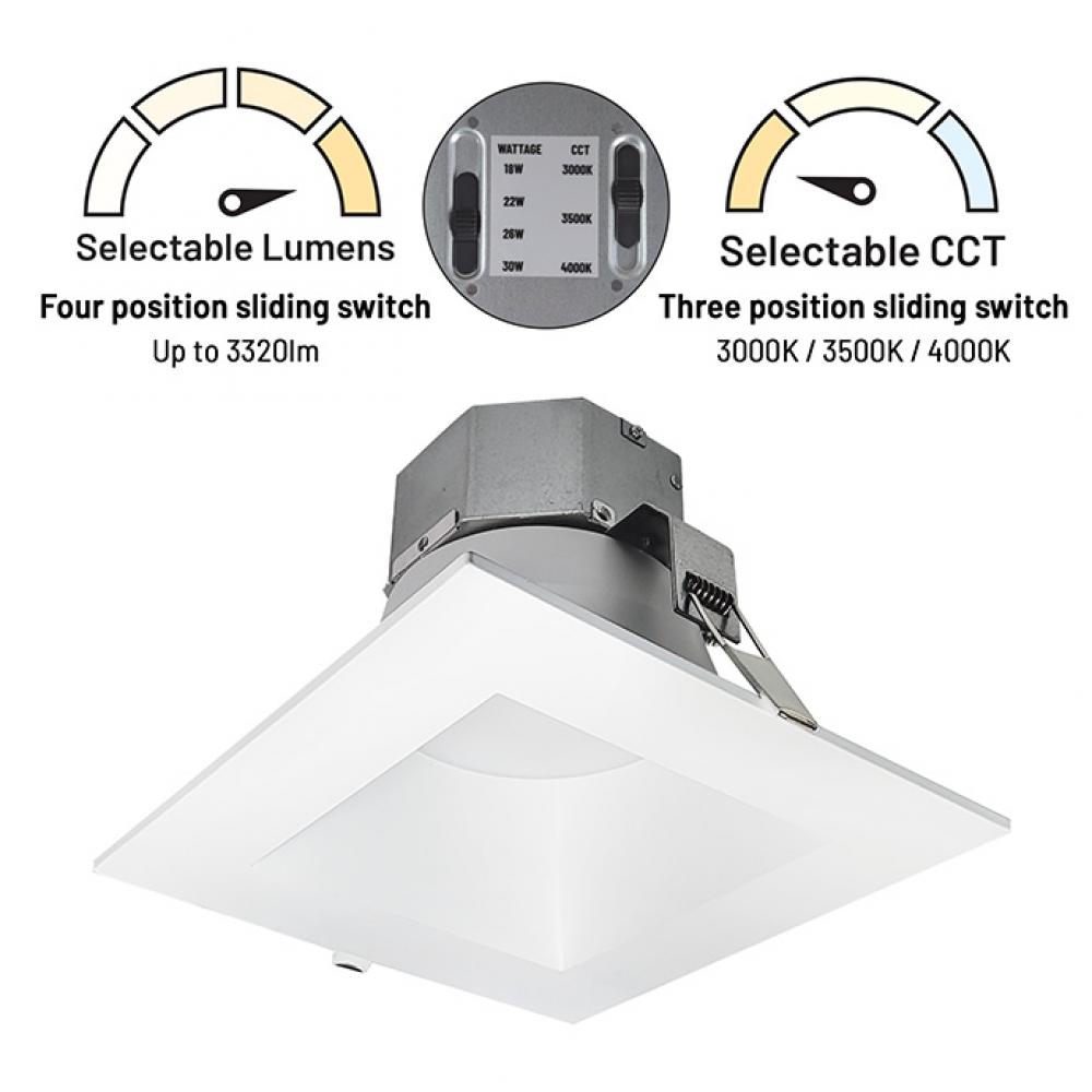 8" Quartz luminaires are architectural and commercial-grade LED high-lumen downlights. Each luminaire includes two tunable switches: Selectable Lumens allows the end user to determine the wattage input, and Selectable CCT allows changing the color temperature appearance. Downlights include two tension steel spring clips, which allow the luminaires to be installed without any frame-in or housing for easy installation. Rating: IC Input Voltage: 120-277VAC Lumens / Wattage: Selectable Lumens (2050lm / 18W; 2450lm / 22W; 2900lm / 26W; 3300lm / 30W) Color Temperature: Selectable CCT (3000K / 3500K / 4000K) Dimming: 0-10V Finish: White Accessories: New construction frame-in (NQZ2-8S-F) Emergency: Remote emergency battery ordered separately (NEPK-20LEDUNV) Listing: cETLus Listed for Wet Locations