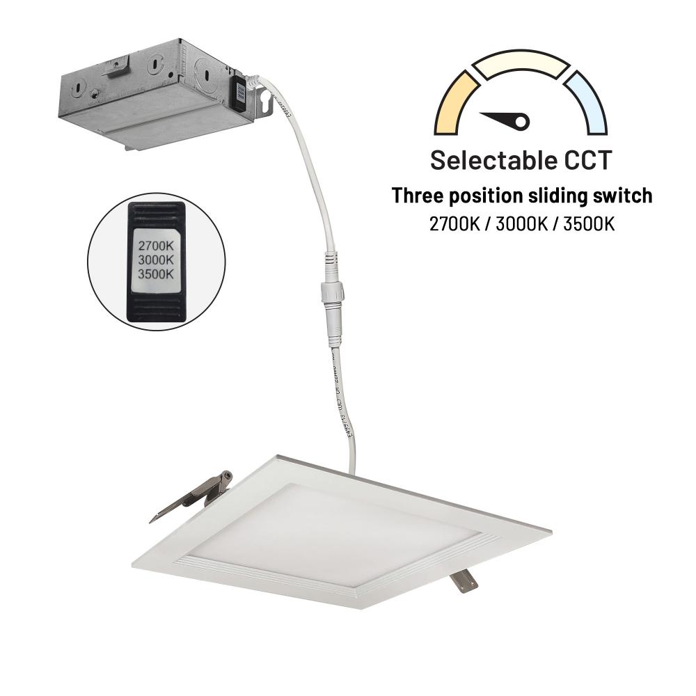 6" Square E-Series FLIN are a thin can-less recessed downlight for easy installation in new construction or remodel applications. Luminaires include a selectable color temperature switch located on the junction box of each luminaire with a quick connect that allows for easy disconnect and mounting in the ceiling. Input Voltage: 120-277VAC Lumens / Wattage: 1150lm / 13.5W Color Temperature: Selectable CCT (2700K/3000K/3500K) Color Rendering Index: 90+ CRI Dimming: Triac or ELV Finish: Matte Powder White Listing: cETLus Listed for Wet Locations