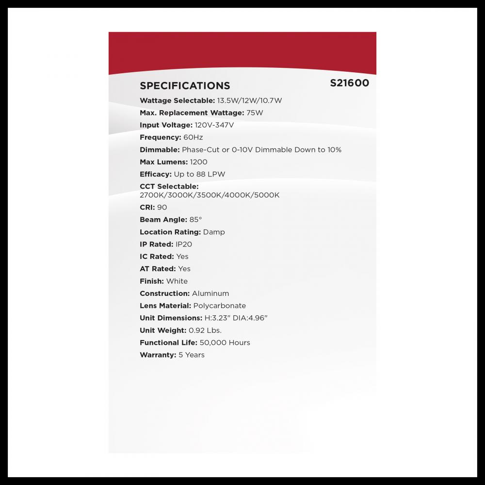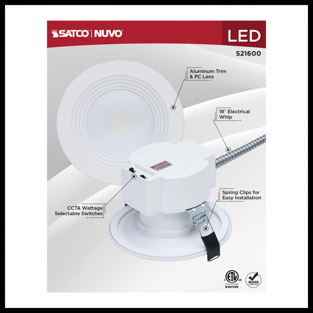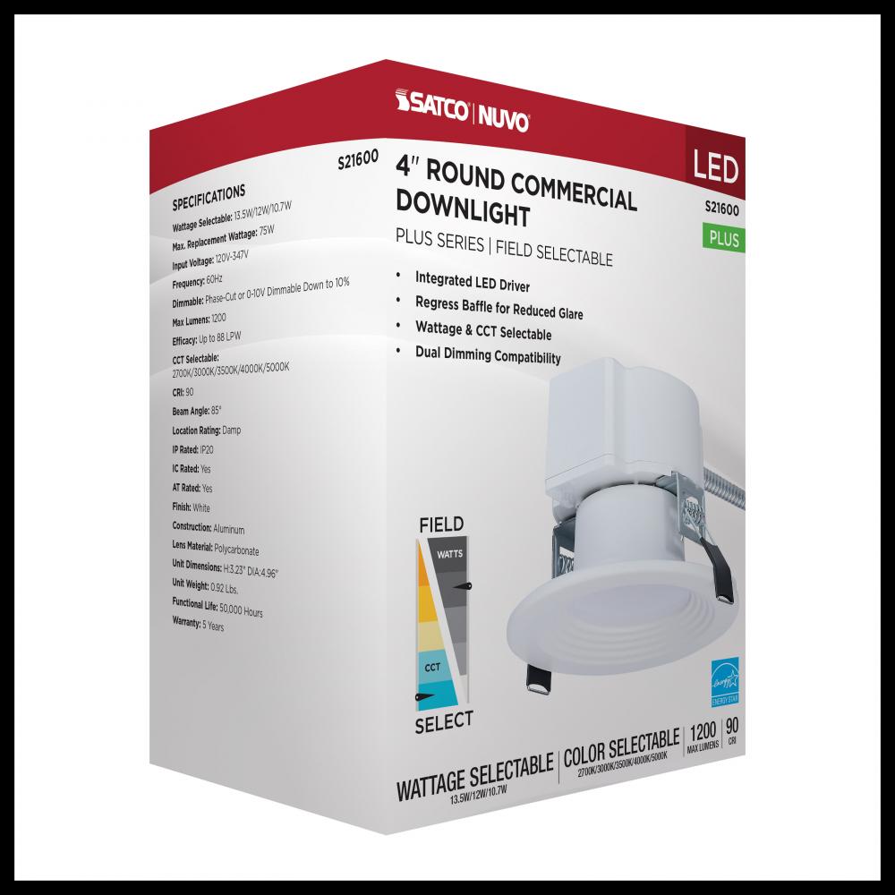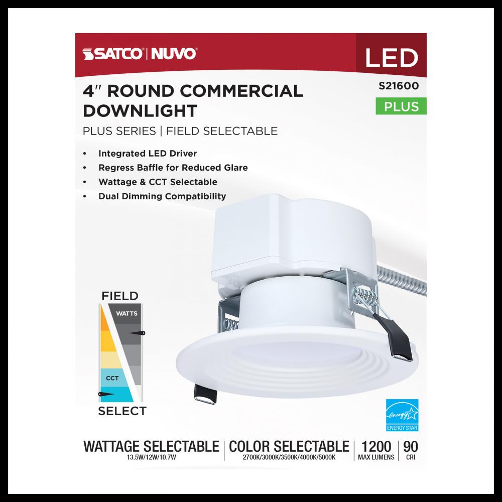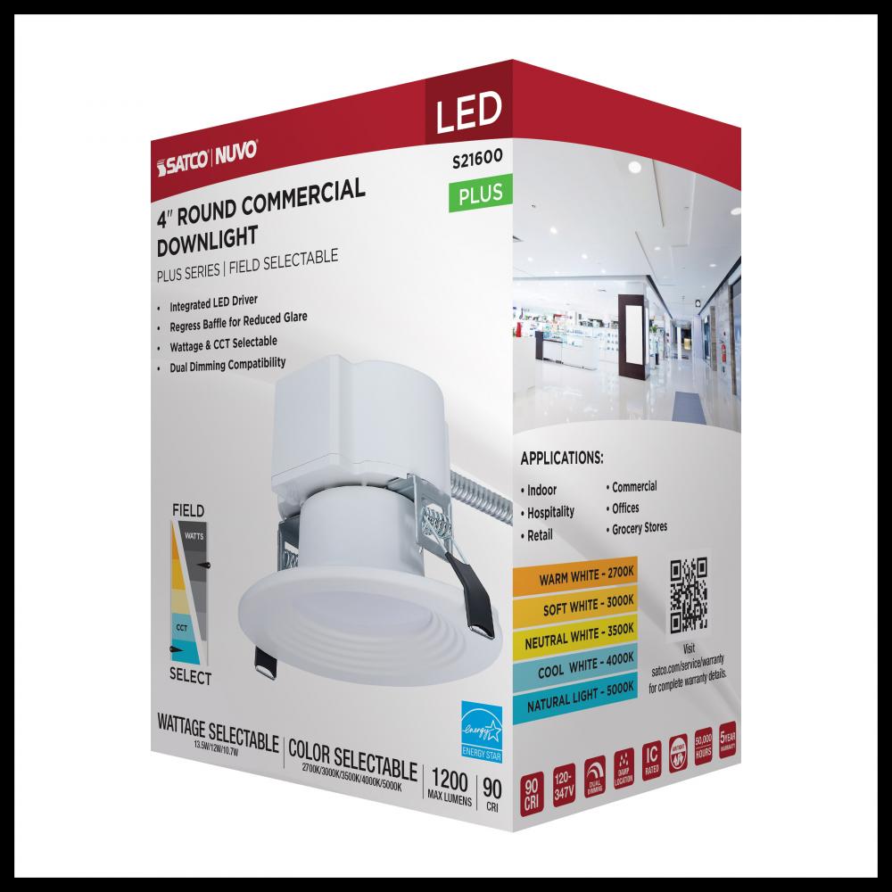 SATCO NUVO's Plus Series LED Commercial Downlight, S21600, delivers exceptional performance and versatility for today's remodel or new construction commercial environments. This 4-inch round fixture features field-selectable wattage and CCT setting