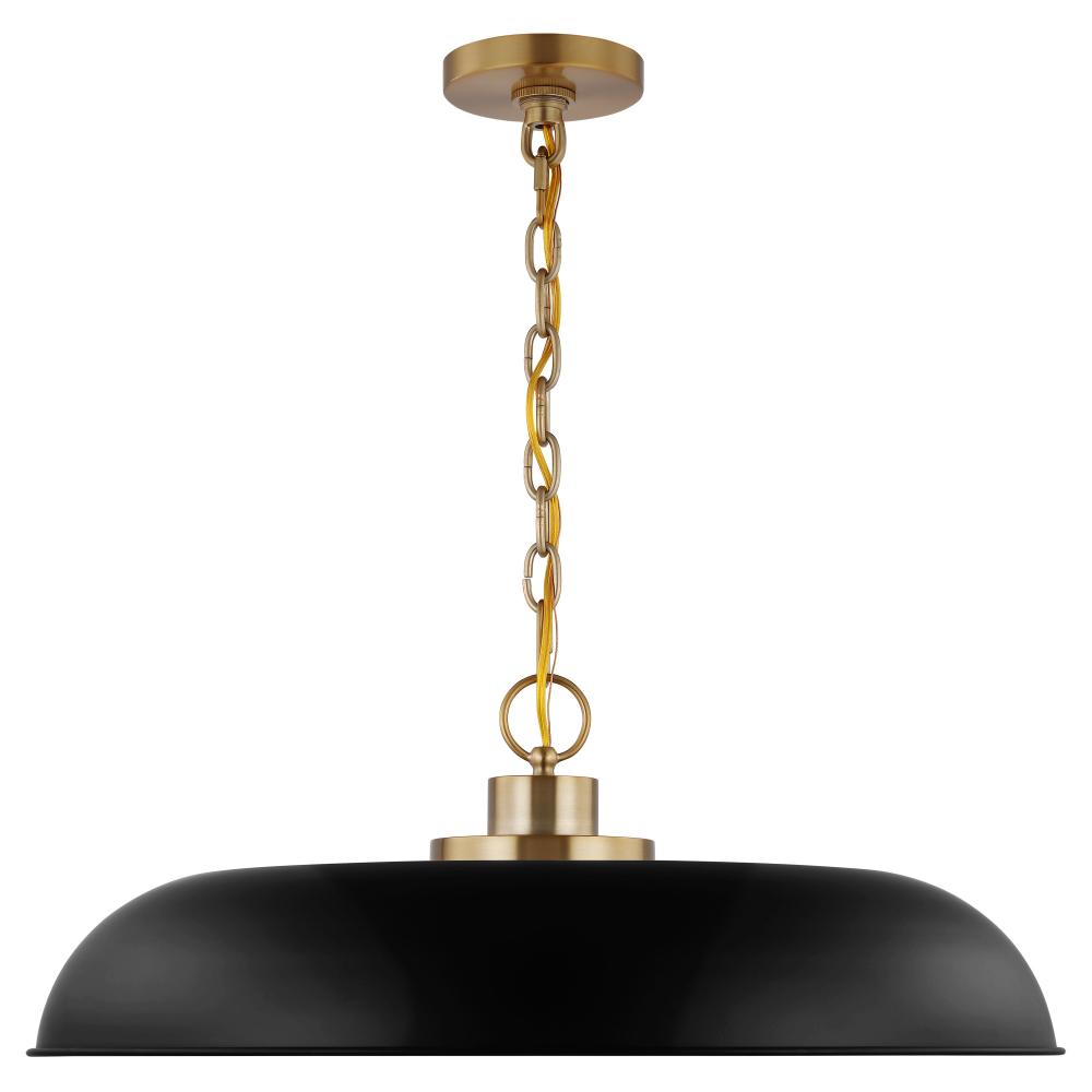 Designed with neutral, clean lines, the Colony large hanging pendant is ideal for an eat-in kitchen, dining room, and even a bedroom. The loft-style shallow pan metal shade is done in matte black with a white interior to reflect the downfacing lamp. The bu